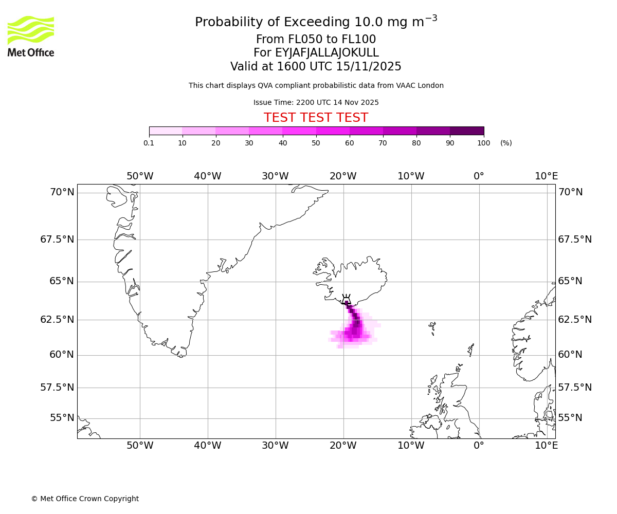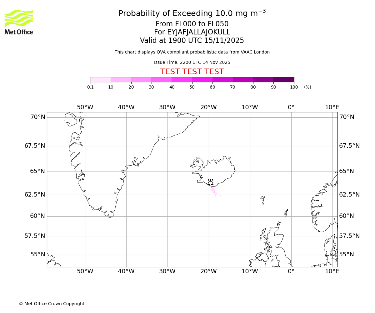 Probability of exceeding 10.0 milligrams per metre cubed. From 000 to 050 for EYJAFJALLAJOKULL. Valid at 1600 UTC 15/11/2025