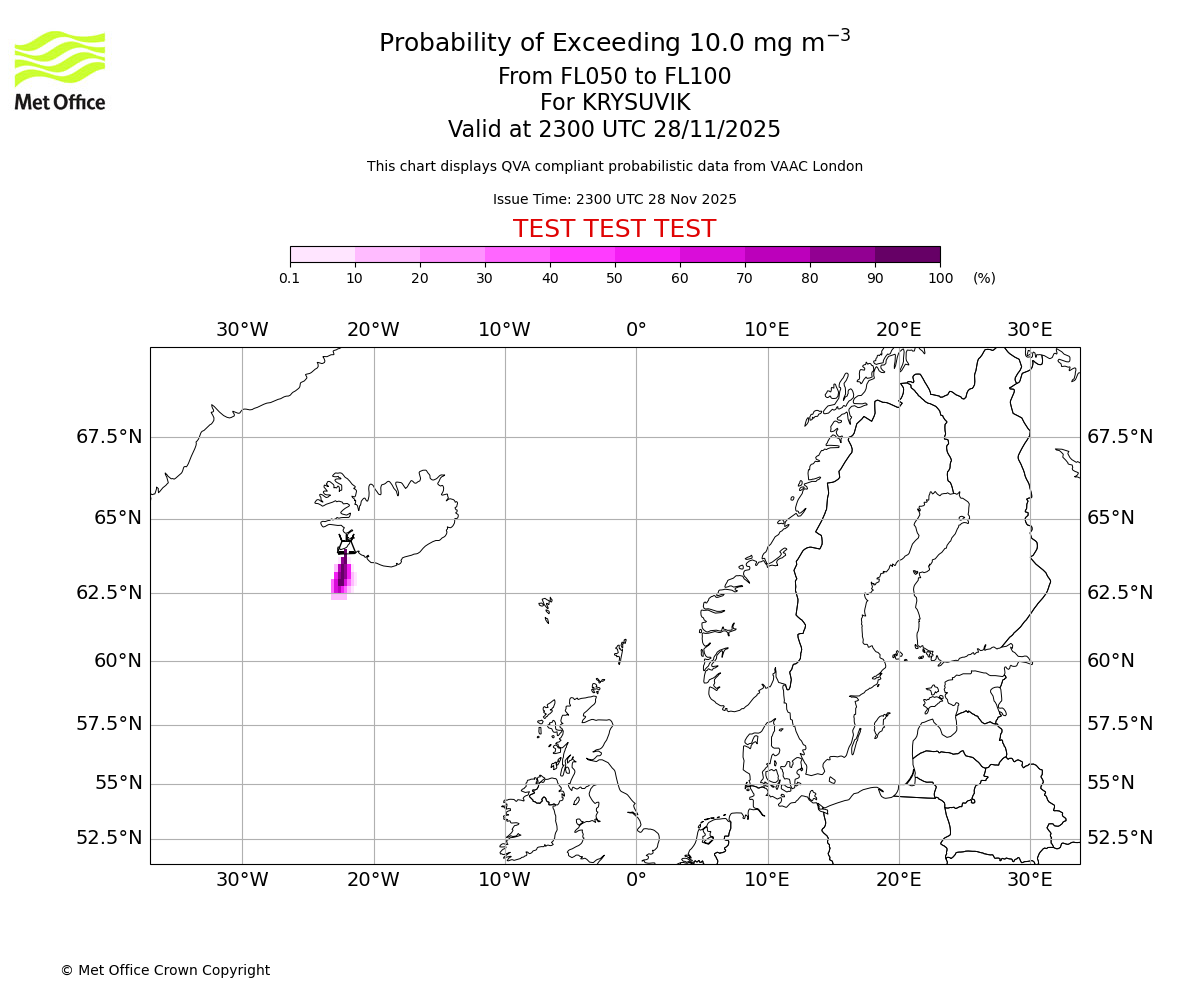 Probability of exceeding 10.0 milligrams per metre cubed. From 000 to 050 for KRYSUVIK. Valid at 2300 UTC 28/11/2025