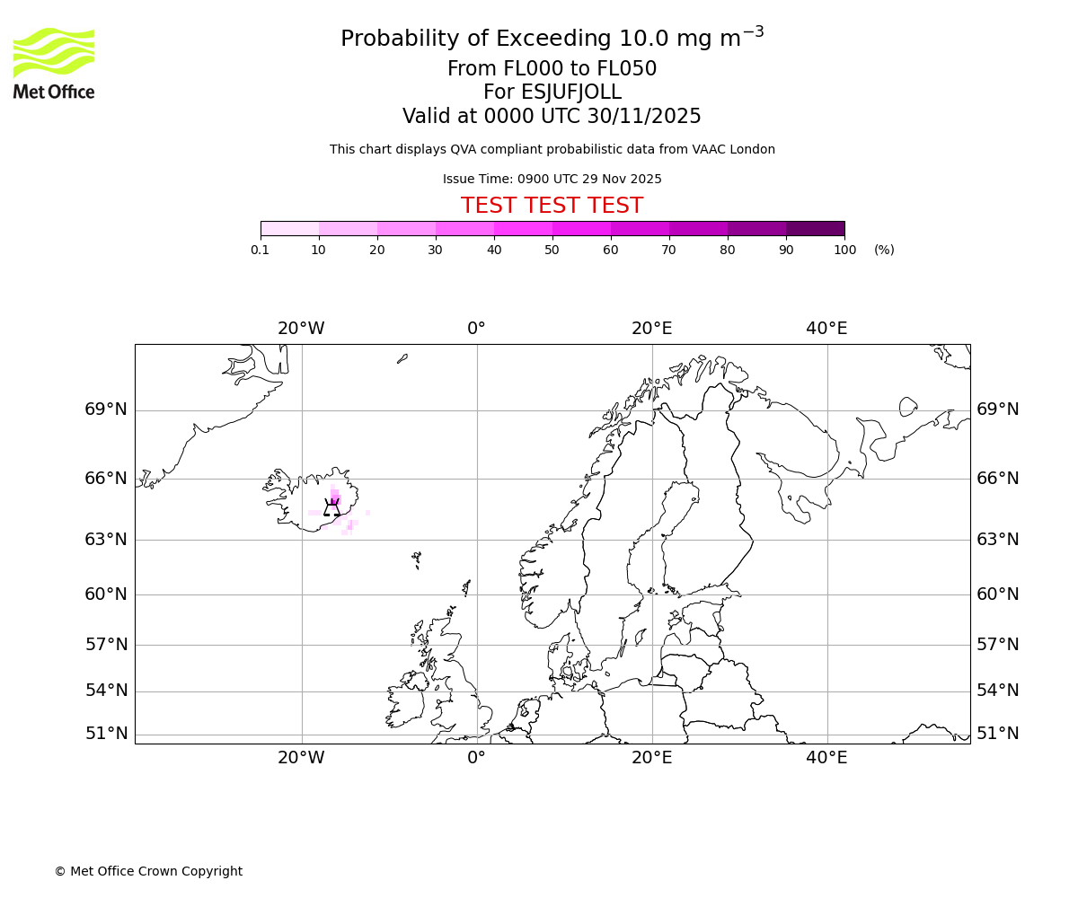 Modelled ash concentration from 000 to 050 for ESJUFJOLL. Valid at 0900 UTC 29/11/2025