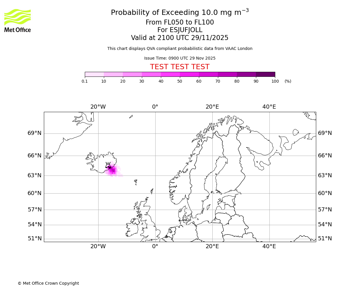 Quantitative Volcanic Ash charts (QVA) are produced in accordance with International Civil Aviation Organization (ICAO) Annex 3 requirements and are provided as well as the London Volcanic Ash Advisory Graphics (VAG) and Advisories (VAA). The lowest QVA threshold (0.2 mg/m³) matches to the areas depicted in the VAA and VAG. Both expected ash concentration and probabilistic forecast information is provided in the chart viewer below for eruptions occurring in the London Volcanic Ash Advisory Centre (VAAC) area of responsibility.