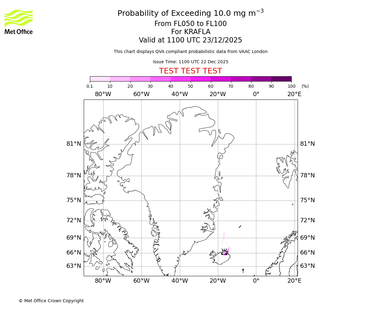 Probability of exceeding 10.0 milligrams per metre cubed. From 000 to 050 for KRAFLA. Valid at 1100 UTC 23/12/2025
