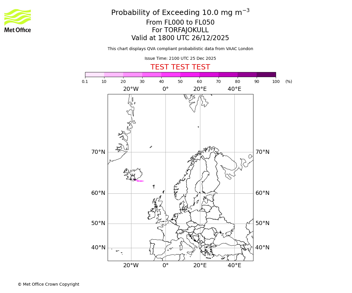 Probability of exceeding 10.0 milligrams per metre cubed. From 000 to 050 for TORFAJOKULL. Valid at 1500 UTC 26/12/2025
