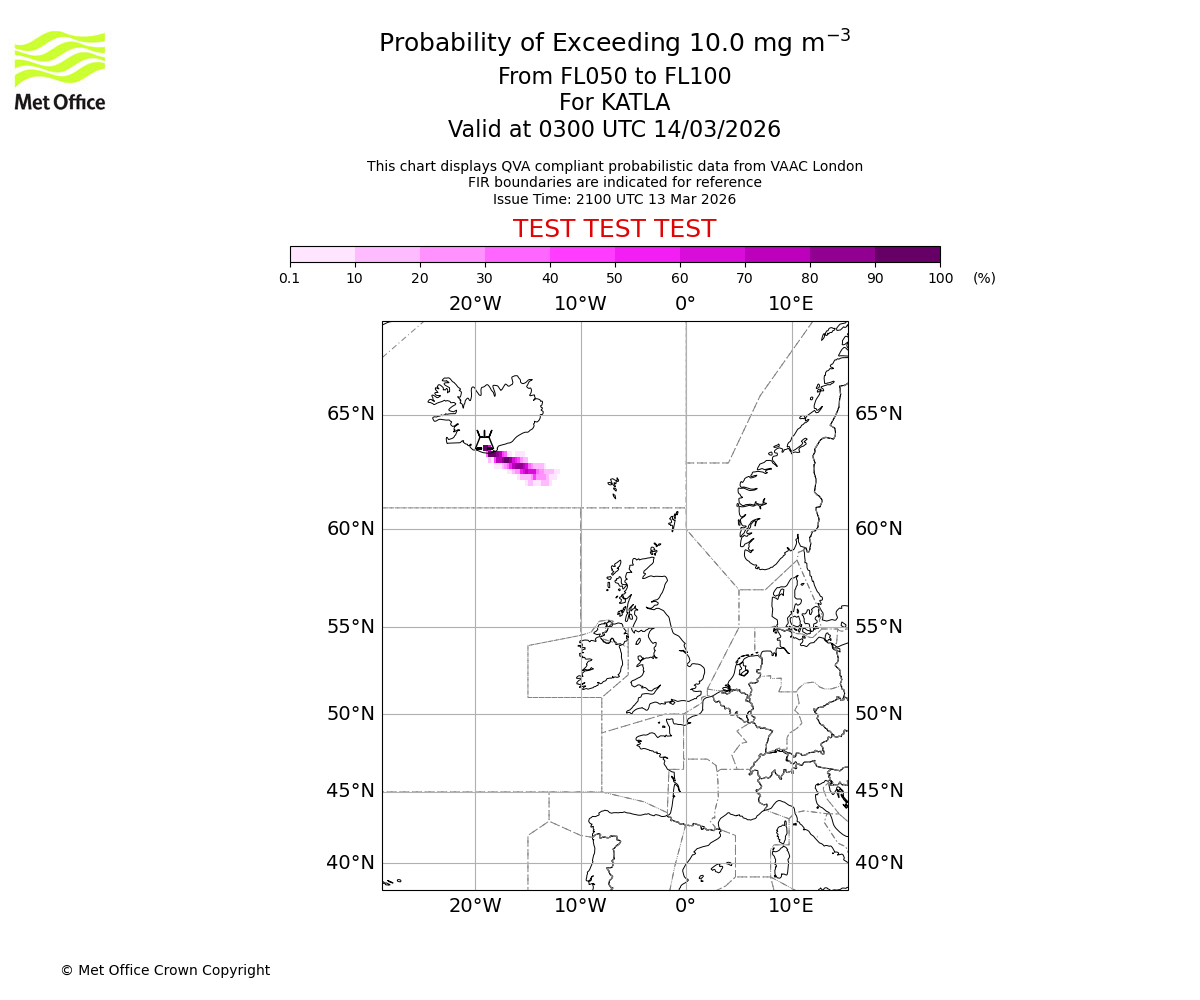 Probability of exceeding 10.0 milligrams per metre cubed. From 000 to 050 for KATLA. Valid at 0300 UTC 14/03/2026