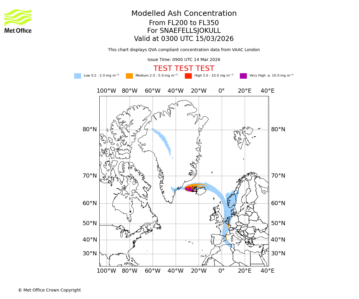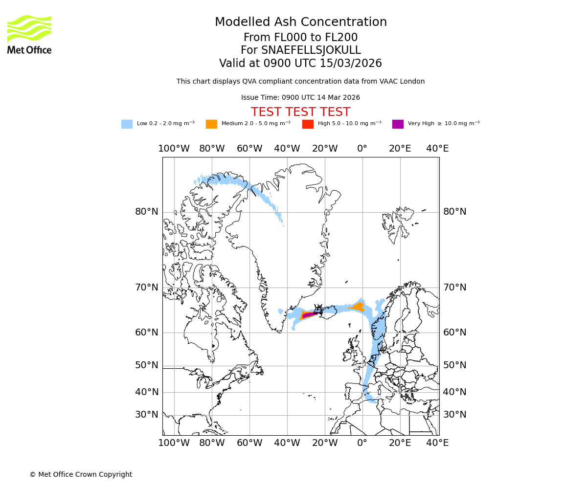 Modelled ash concentration from 000 to 050 for SNAEFELLSJOKULL. Valid at 0900 UTC 14/03/2026