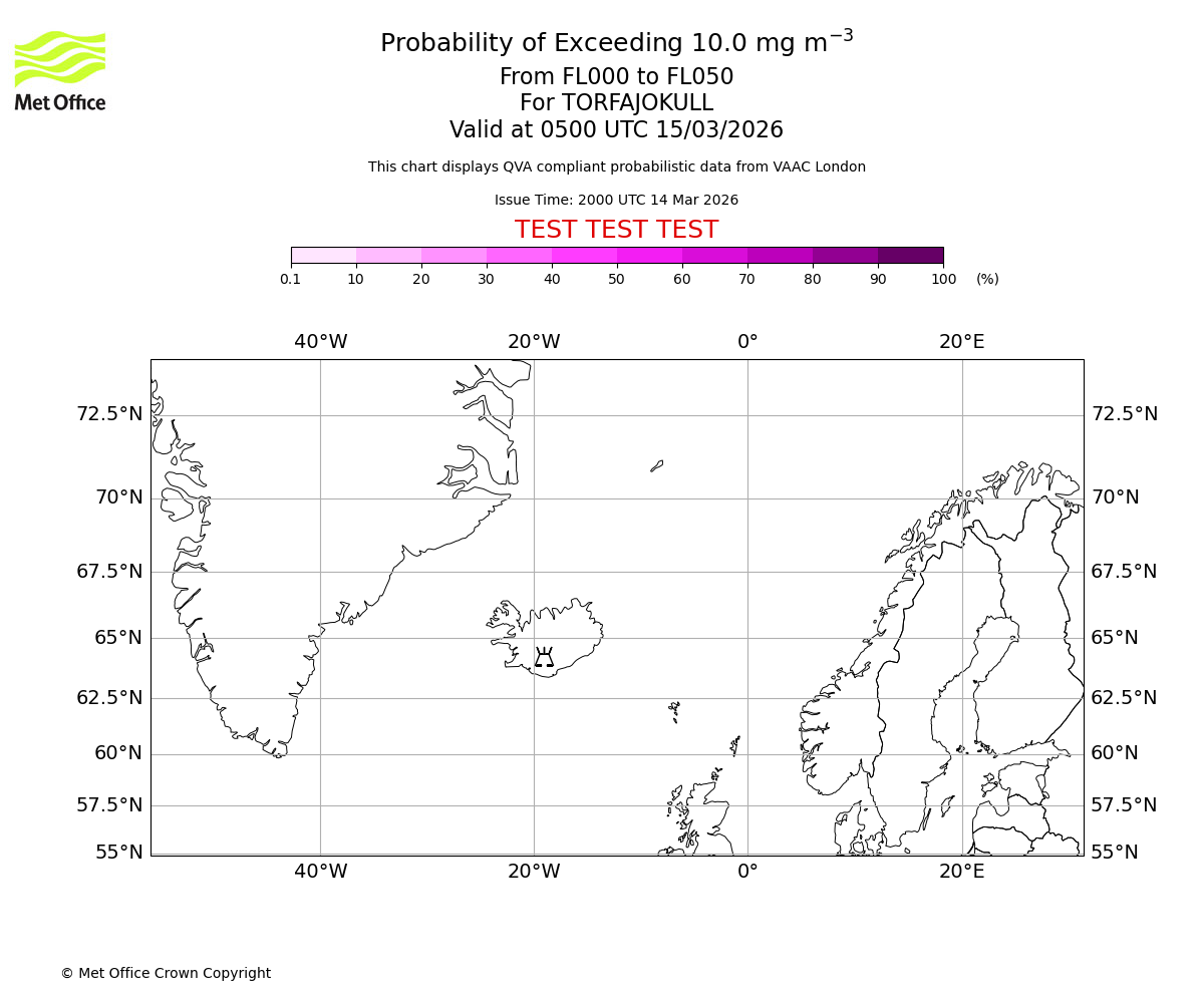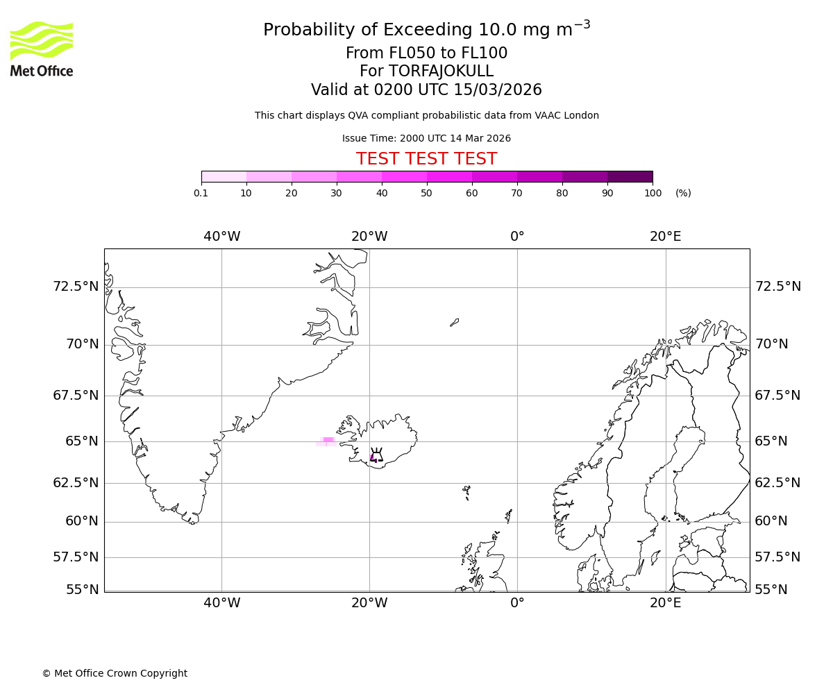 Probability of exceeding 10.0 milligrams per metre cubed. From 000 to 050 for TORFAJOKULL. Valid at 0200 UTC 15/03/2026