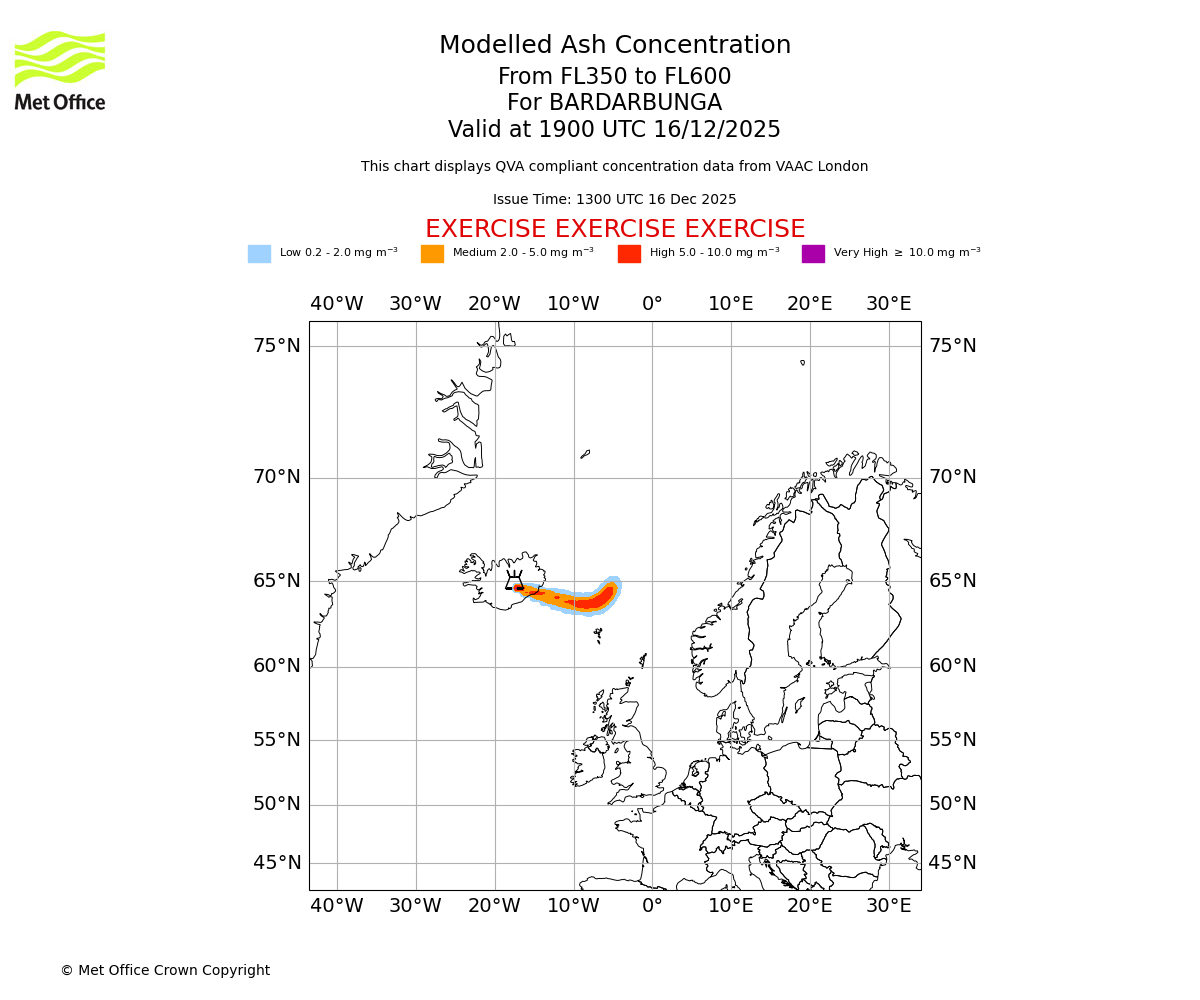Modelled ash concentration from 350 to 600 for BARDARBUNGA. Valid at 1300 UTC 16/12/2025