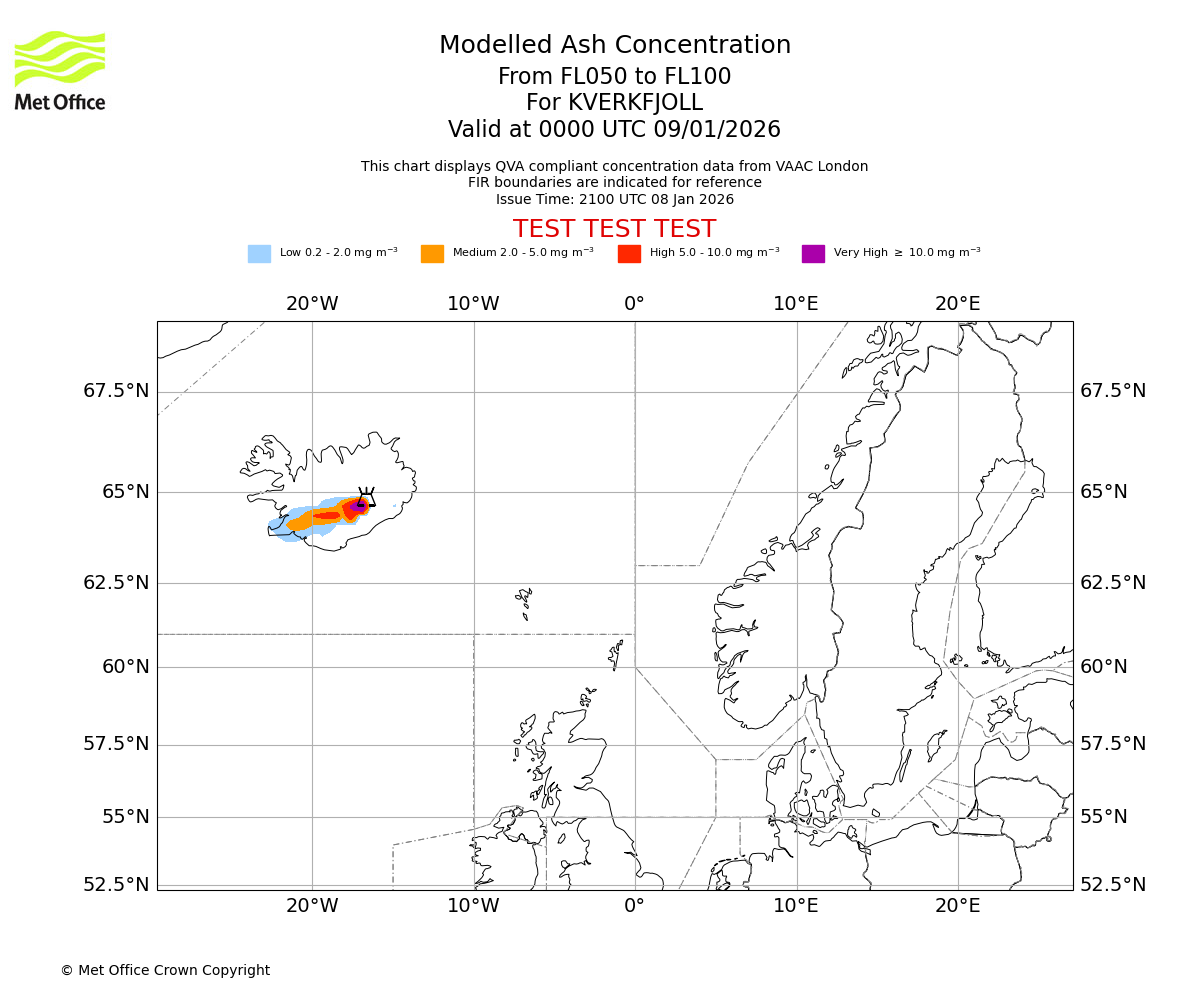 Modelled ash concentration from 050 to 100 for KVERKFJOLL. Valid at 2100 UTC 08/01/2026