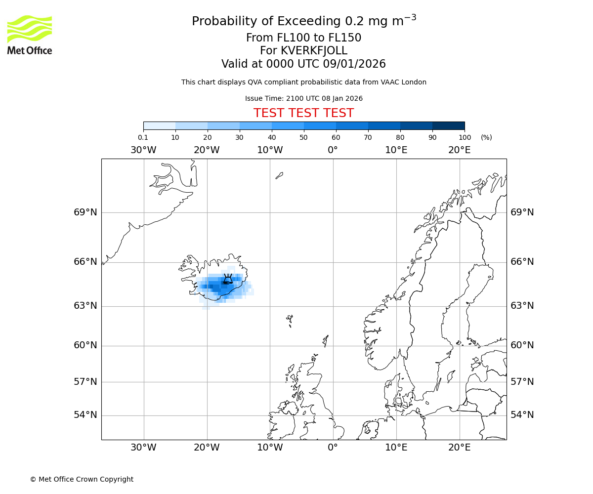 Modelled ash concentration from 000 to 200 for KVERKFJOLL. Valid at 2100 UTC 08/01/2026