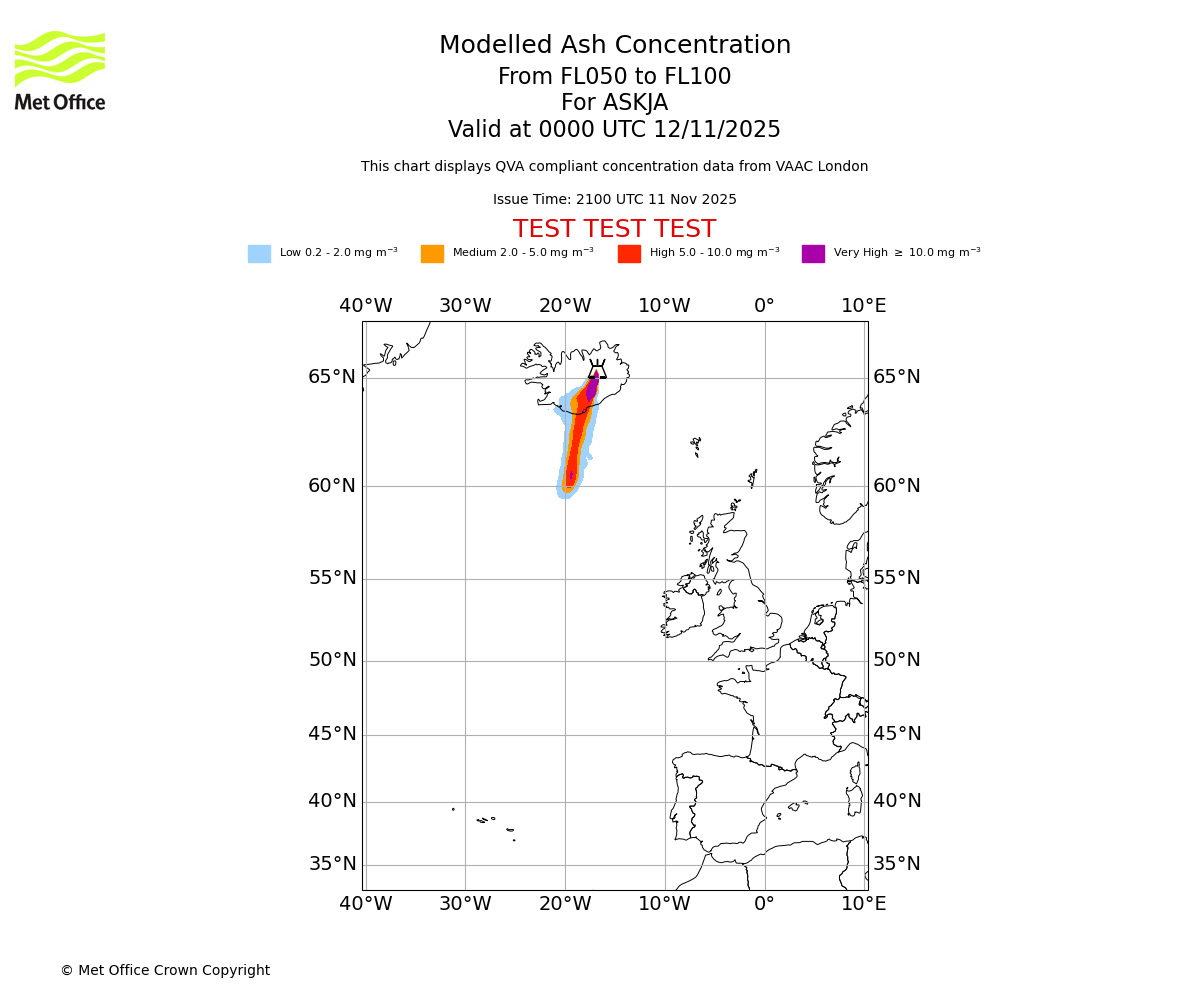 Modelled ash concentration from 050 to 100 for ASKJA. Valid at 2100 UTC 11/11/2025