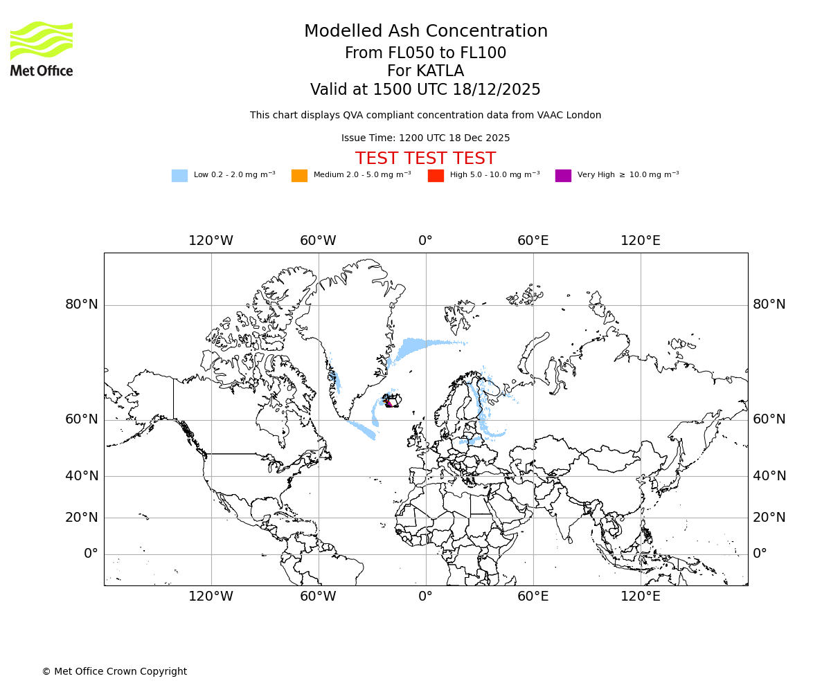 Modelled ash concentration from 050 to 100 for KATLA. Valid at 1200 UTC 18/12/2025