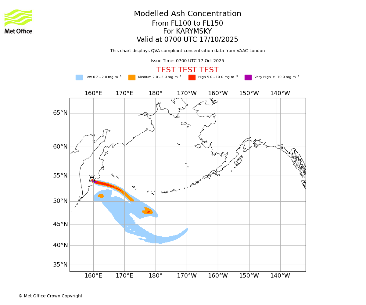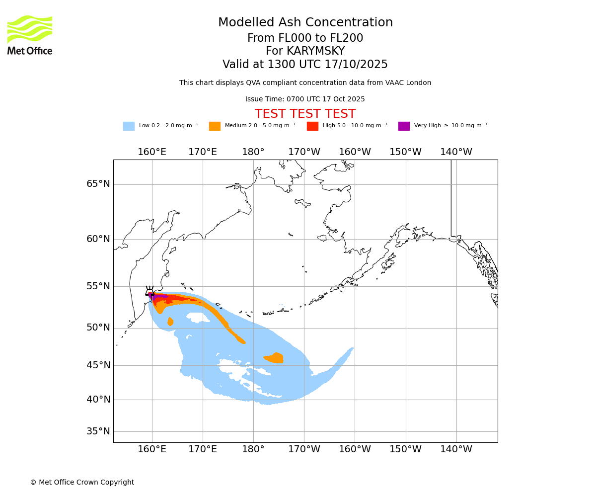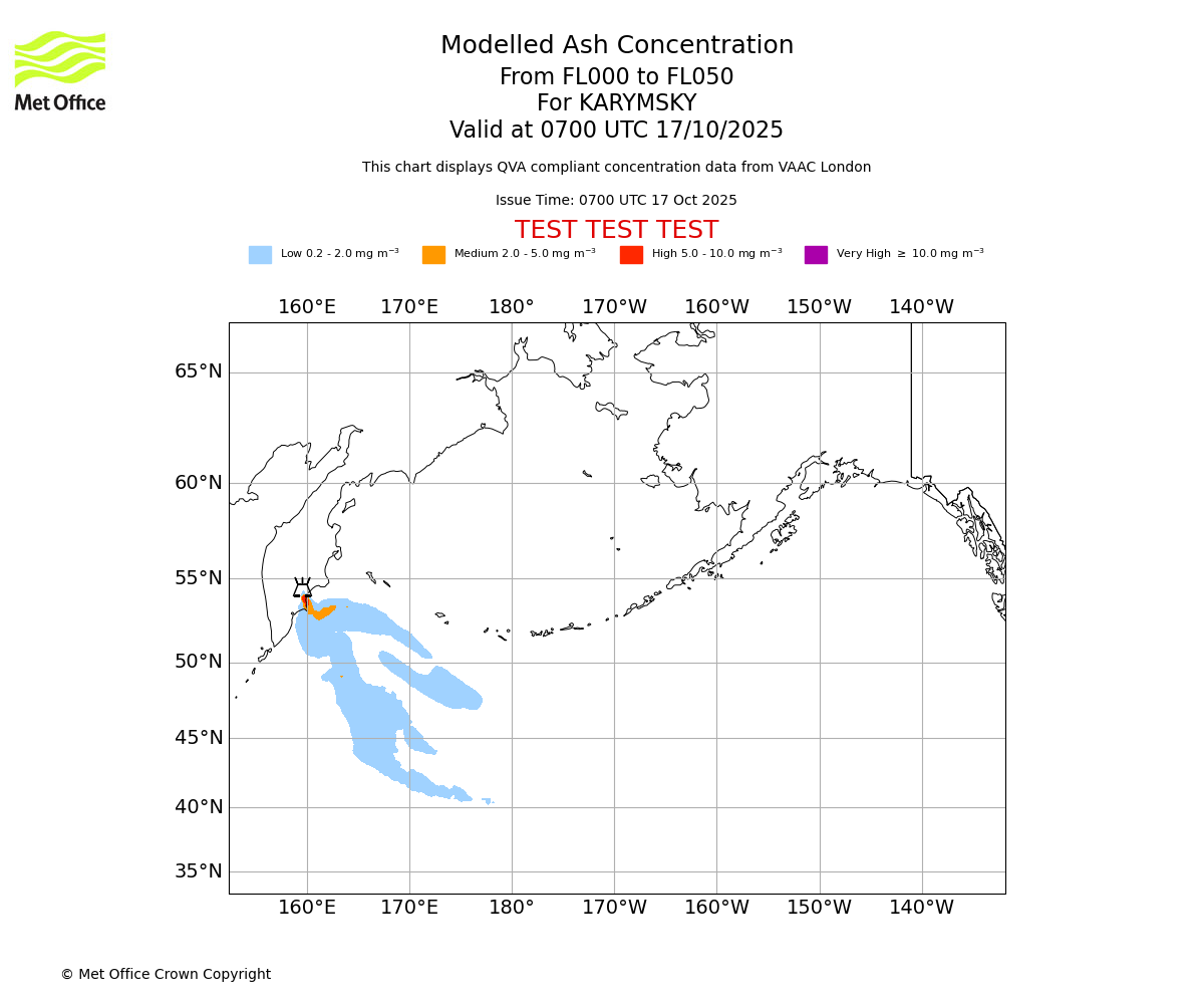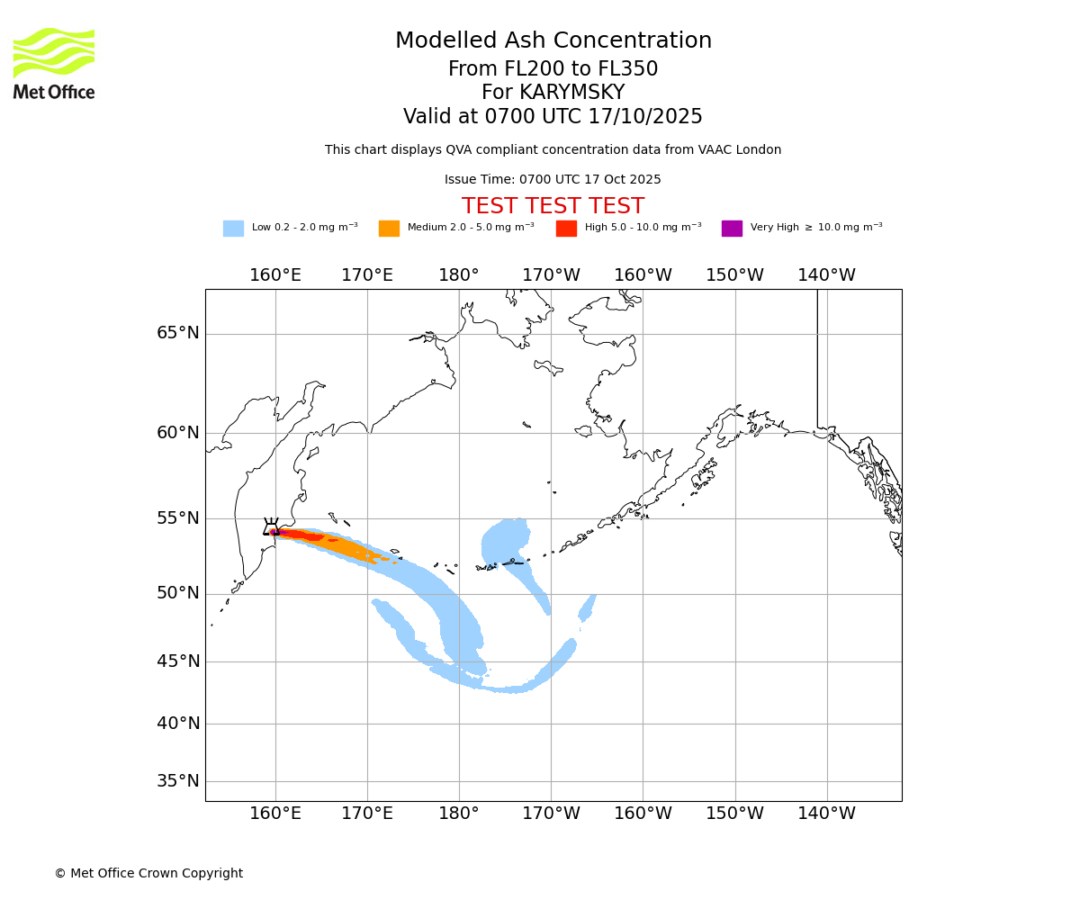 Modelled ash concentration from 000 to 200 for KARYMSKY. Valid at 0700 UTC 17/10/2025