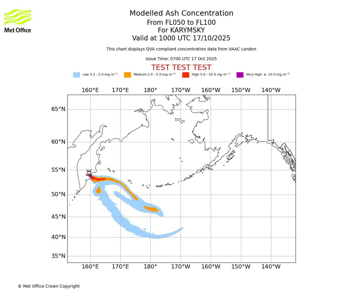 Modelled ash concentration from 050 to 100 for KARYMSKY. Valid at 0700 UTC 17/10/2025