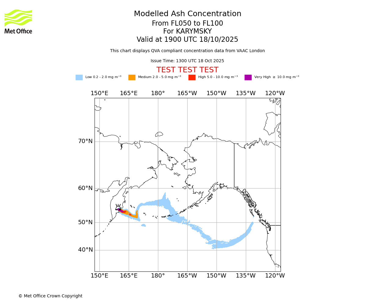 Modelled ash concentration from 000 to 200 for KARYMSKY. Valid at 1300 UTC 18/10/2025