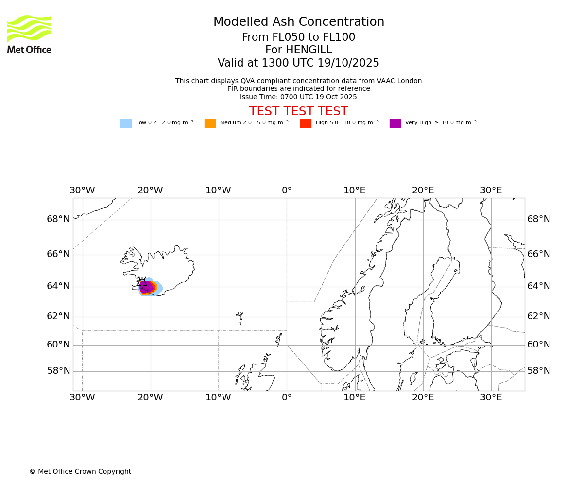 Modelled ash concentration from 050 to 100 for HENGILL. Valid at 1000 UTC 19/10/2025