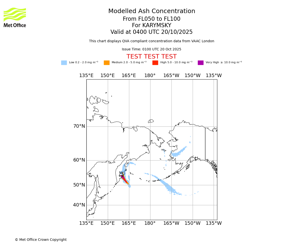 Modelled ash concentration from 050 to 100 for KARYMSKY. Valid at 0100 UTC 20/10/2025