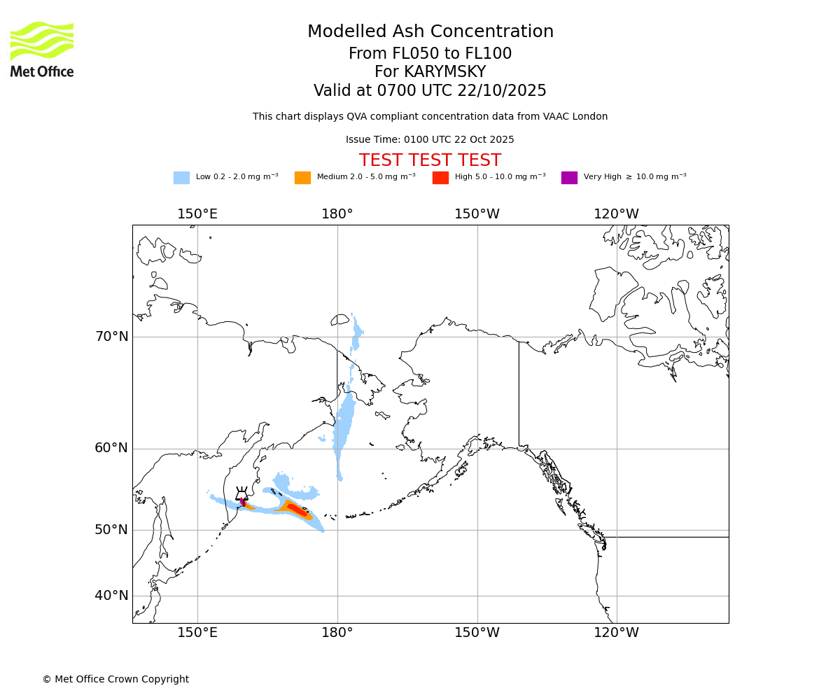 Modelled ash concentration from 050 to 100 for KARYMSKY. Valid at 0400 UTC 22/10/2025