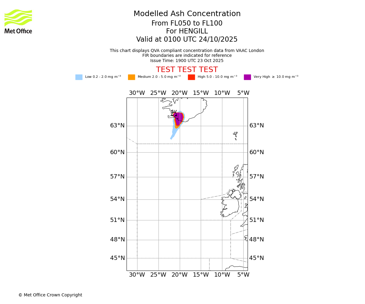 Modelled ash concentration from 050 to 100 for HENGILL. Valid at 2200 UTC 23/10/2025