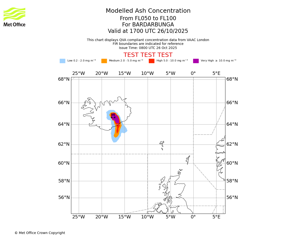 Modelled ash concentration from 050 to 100 for BARDARBUNGA. Valid at 1400 UTC 26/10/2025