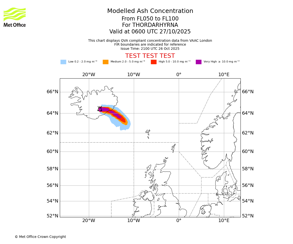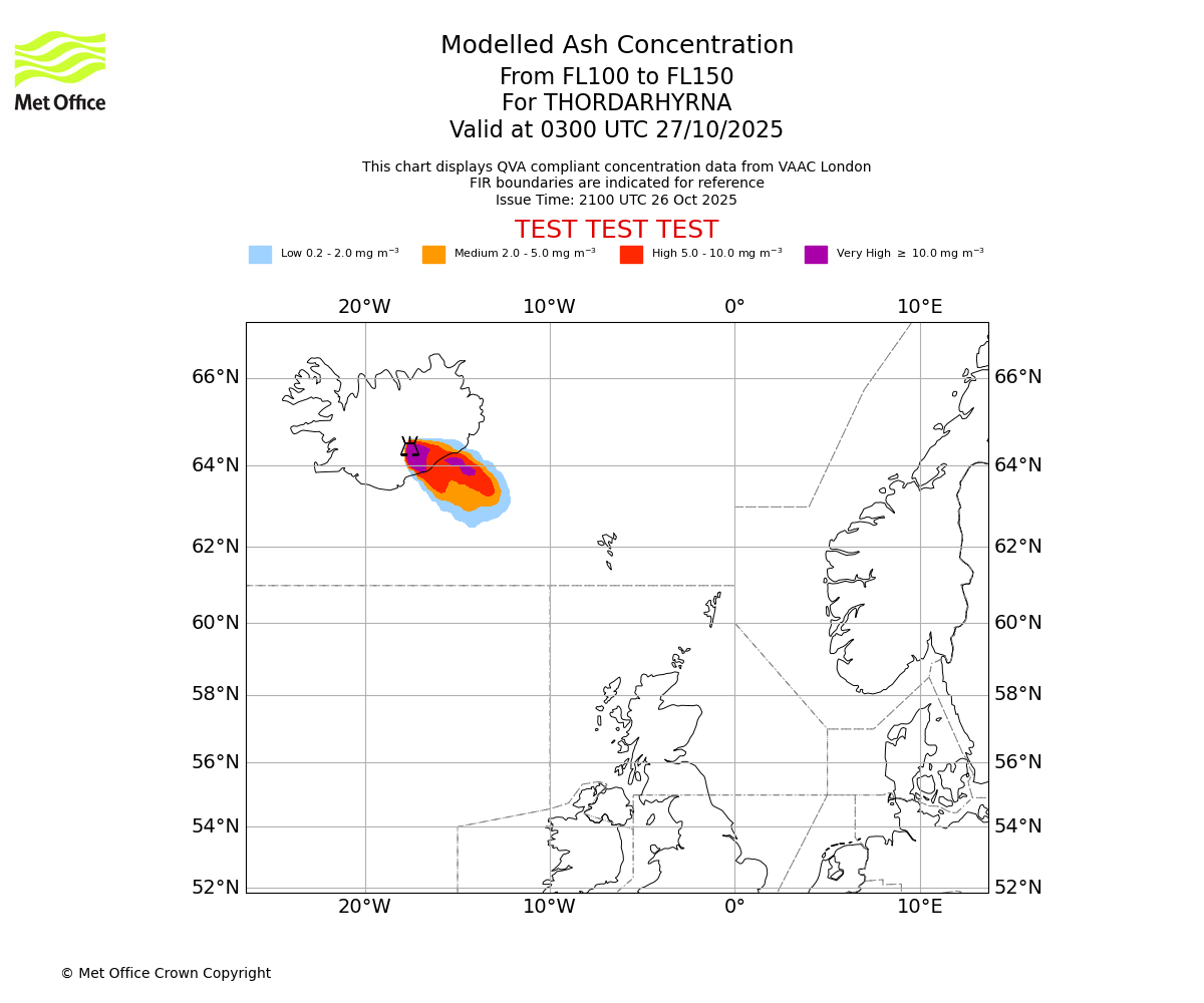Modelled ash concentration from 050 to 100 for THORDARHYRNA. Valid at 0300 UTC 27/10/2025