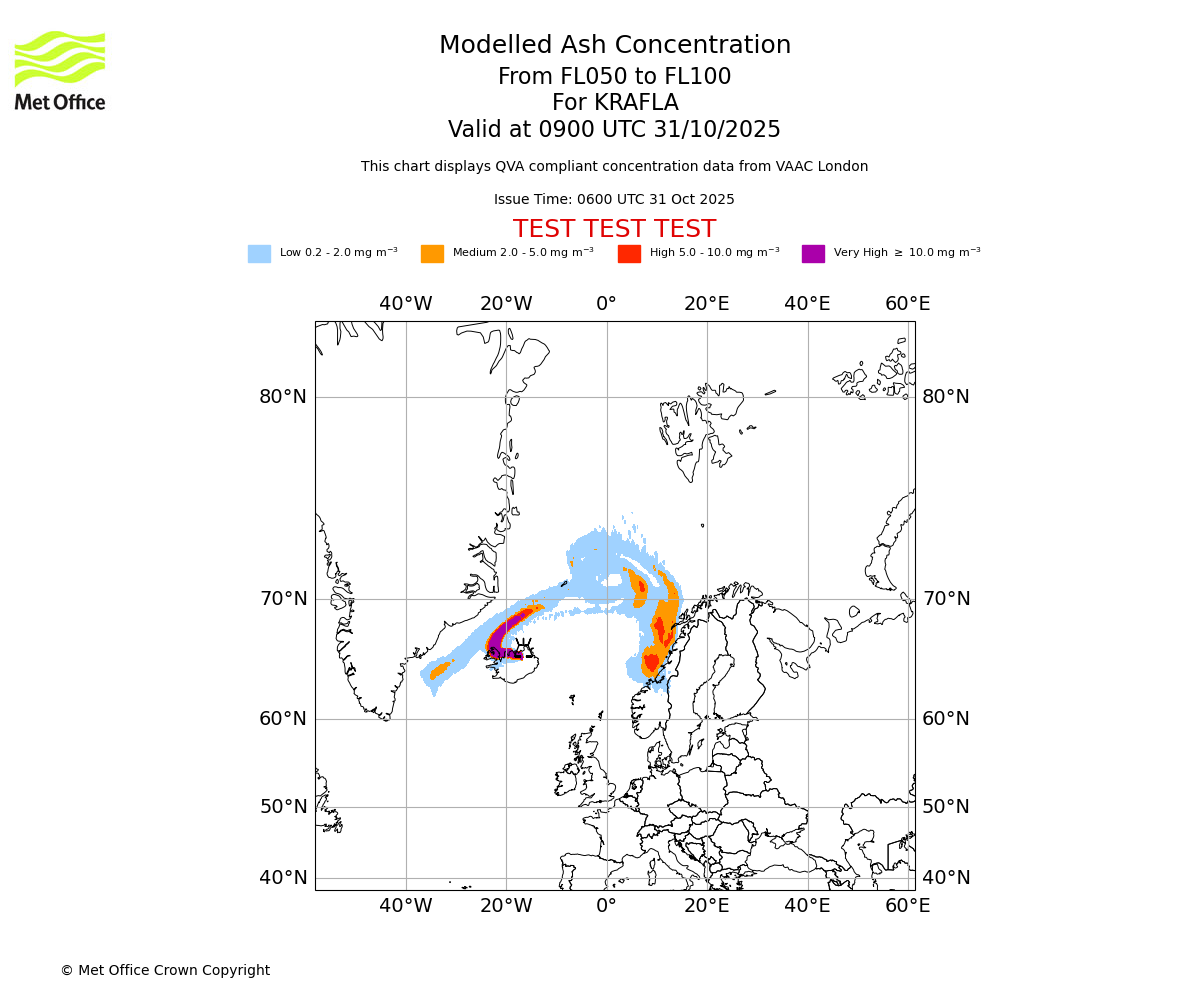 Modelled ash concentration from 050 to 100 for KRAFLA. Valid at 0600 UTC 31/10/2025