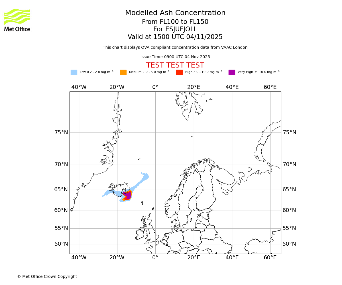 Modelled ash concentration from 050 to 100 for ESJUFJOLL. Valid at 1500 UTC 04/11/2025