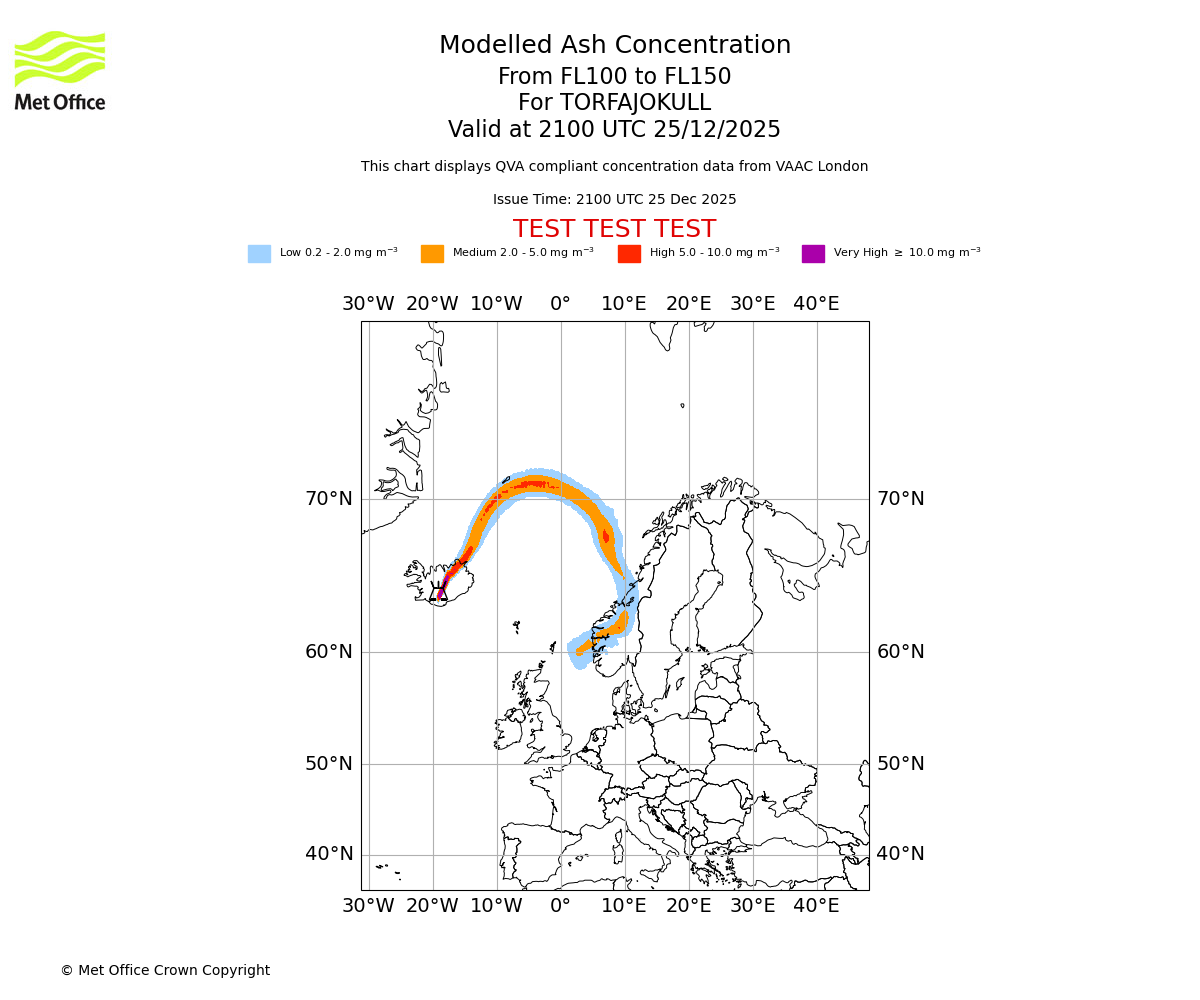 Modelled ash concentration from 050 to 100 for TORFAJOKULL. Valid at 2100 UTC 25/12/2025