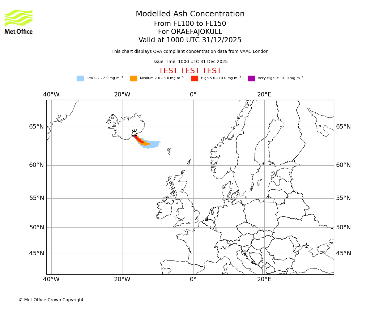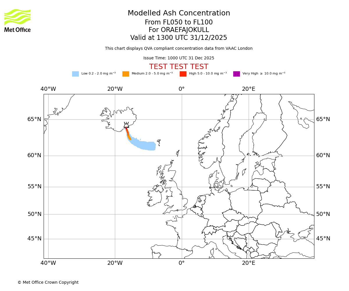 Modelled ash concentration from 050 to 100 for ORAEFAJOKULL. Valid at 1000 UTC 31/12/2025