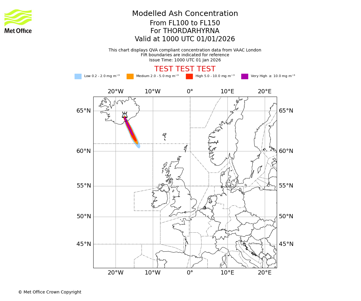 Modelled ash concentration from 000 to 200 for THORDARHYRNA. Valid at 1000 UTC 01/01/2026