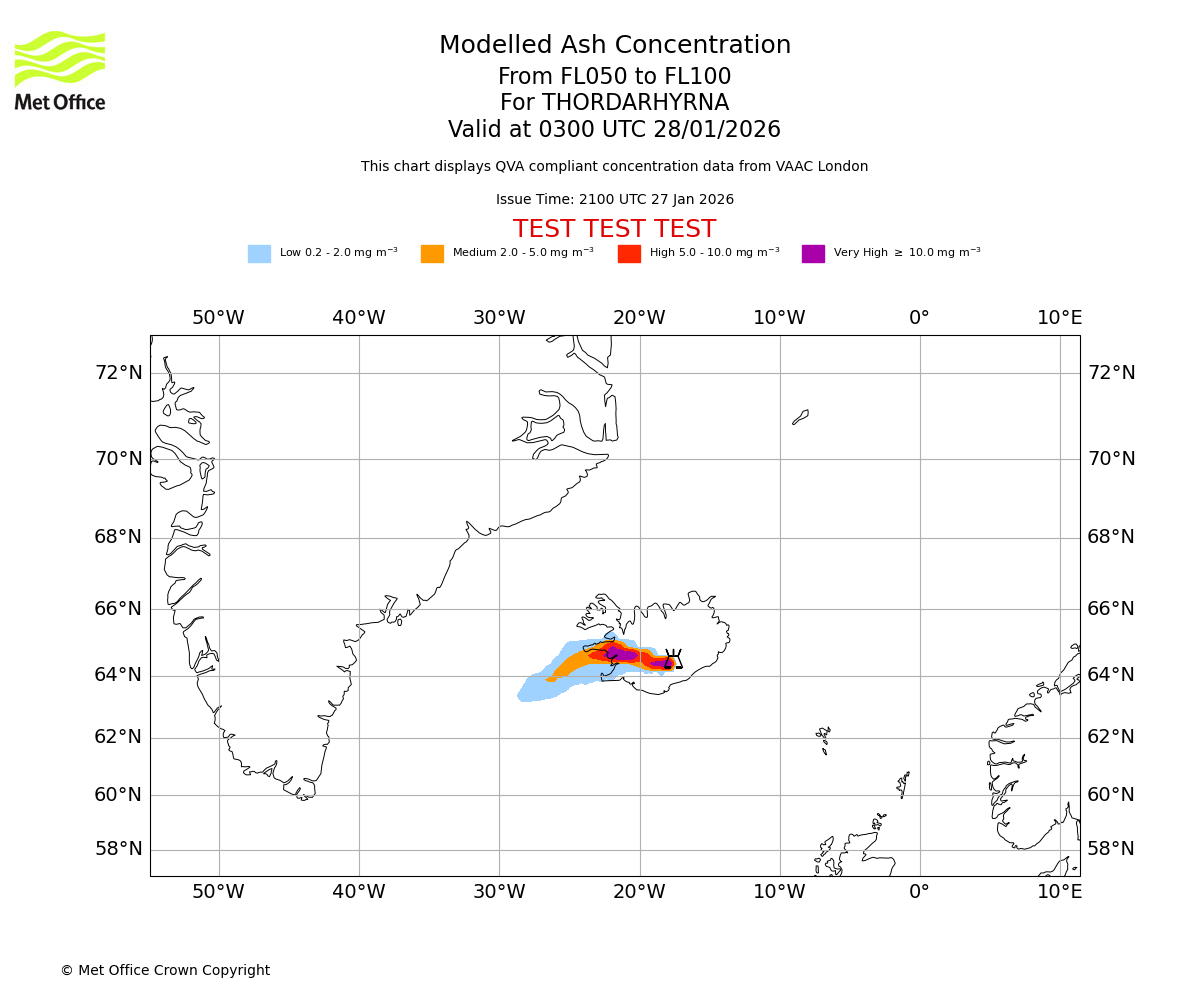 Modelled ash concentration from 050 to 100 for THORDARHYRNA. Valid at 0000 UTC 28/01/2026