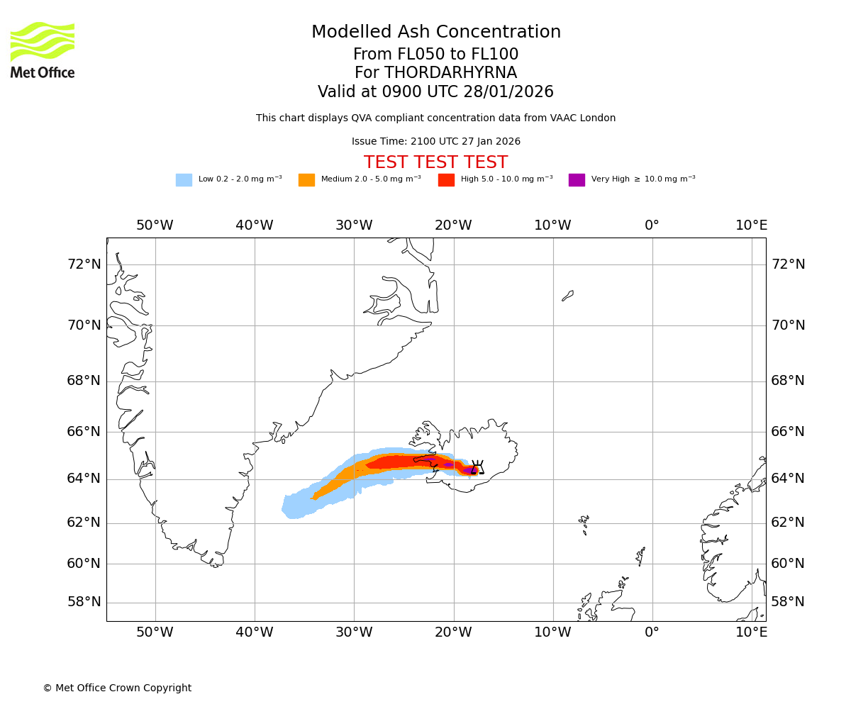 Modelled ash concentration from 050 to 100 for THORDARHYRNA. Valid at 0600 UTC 28/01/2026