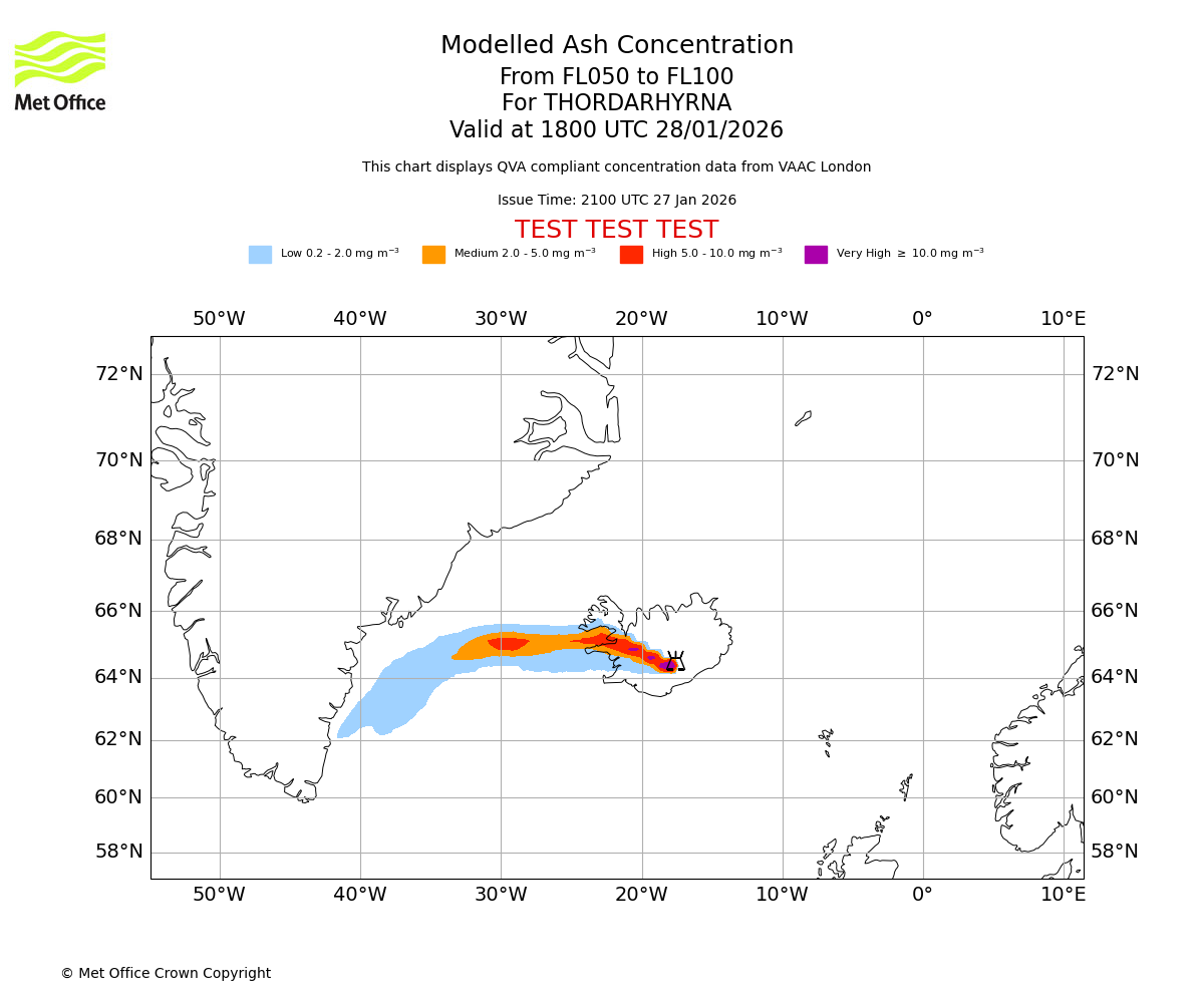 Modelled ash concentration from 050 to 100 for THORDARHYRNA. Valid at 1500 UTC 28/01/2026