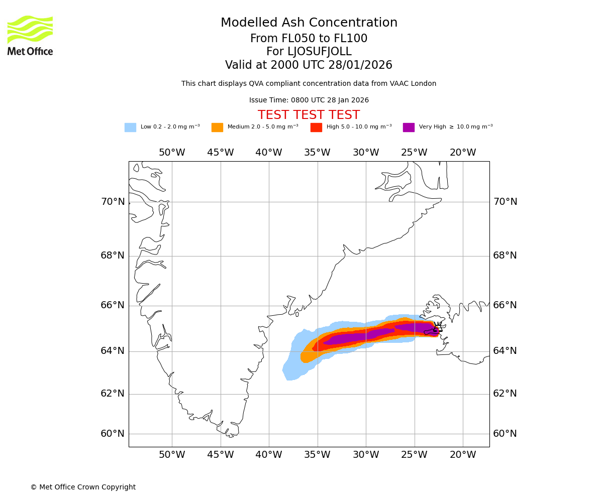 Modelled ash concentration from 000 to 200 for LJOSUFJOLL. Valid at 0800 UTC 28/01/2026