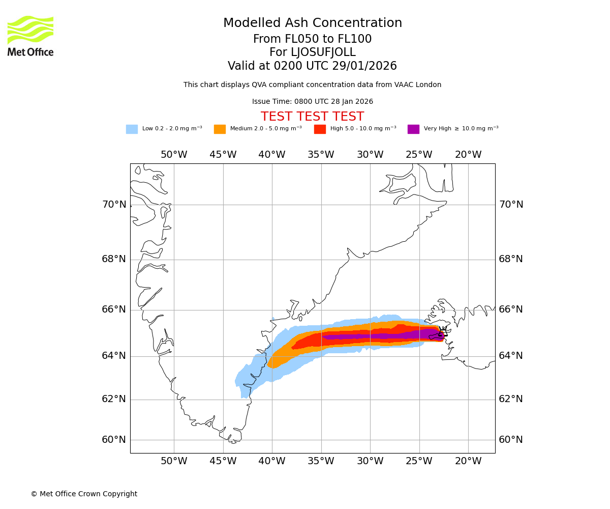 Modelled ash concentration from 050 to 100 for LJOSUFJOLL. Valid at 2300 UTC 28/01/2026