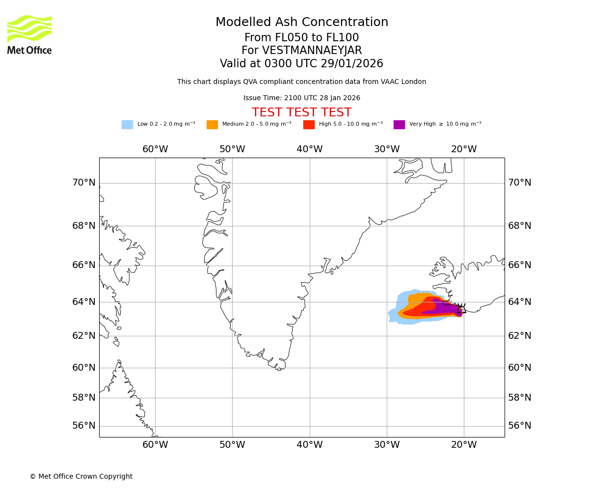 Modelled ash concentration from 050 to 100 for VESTMANNAEYJAR. Valid at 0000 UTC 29/01/2026