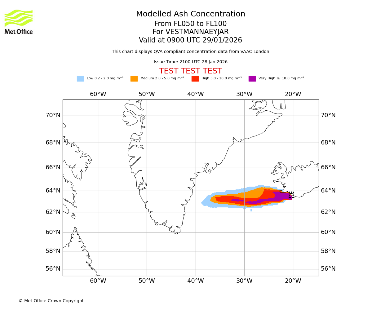 Modelled ash concentration from 050 to 100 for VESTMANNAEYJAR. Valid at 0600 UTC 29/01/2026