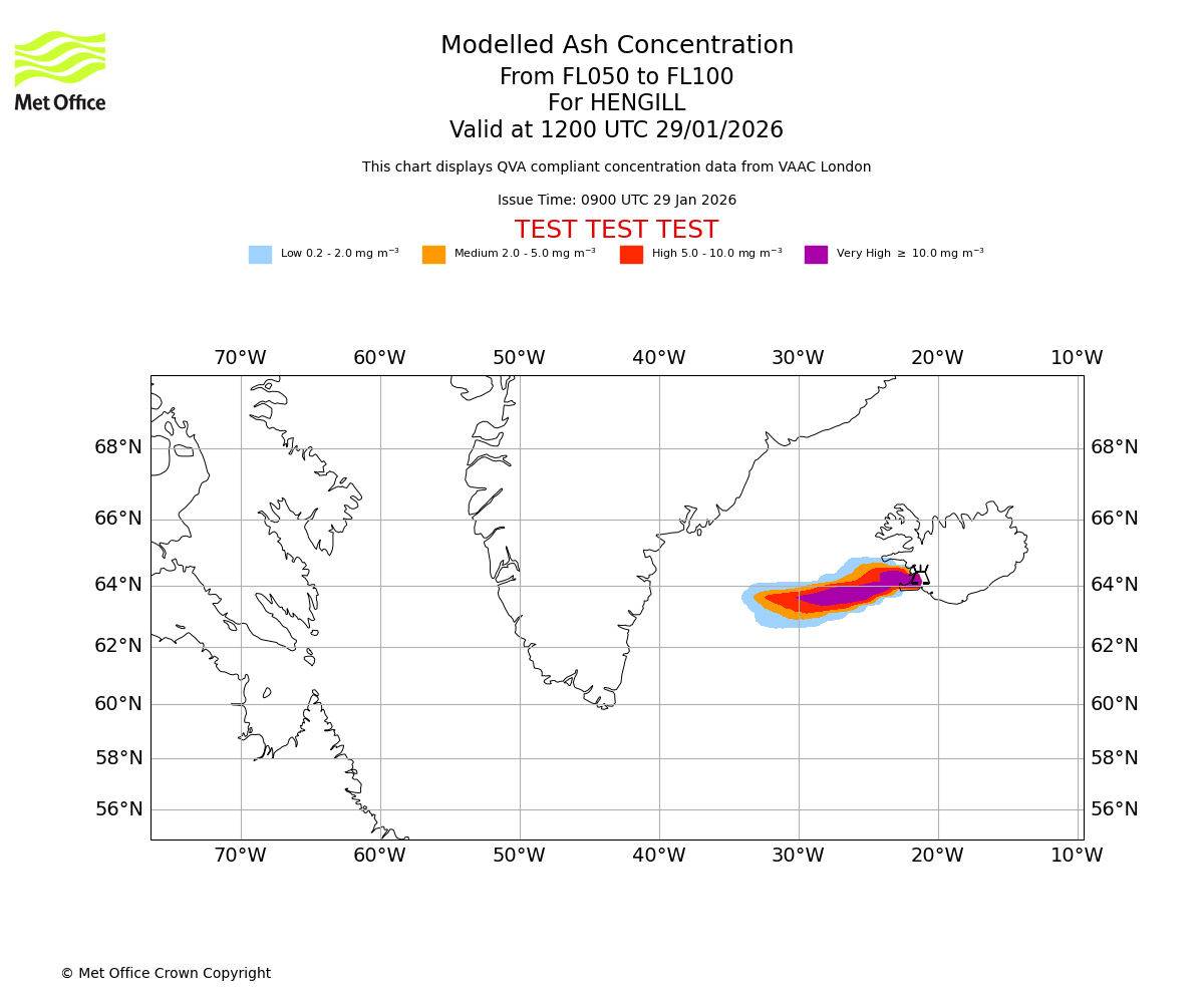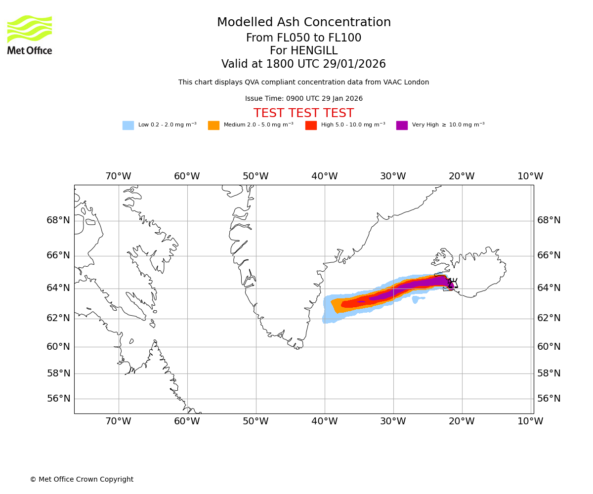 Modelled ash concentration from 050 to 100 for HENGILL. Valid at 1500 UTC 29/01/2026
