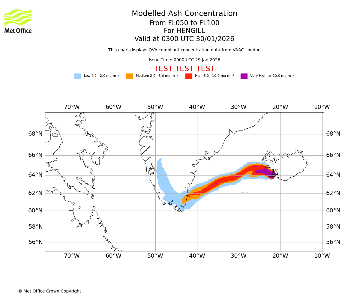 Modelled ash concentration from 050 to 100 for HENGILL. Valid at 0000 UTC 30/01/2026
