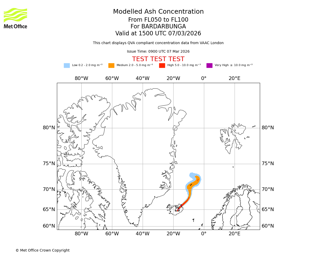 Modelled ash concentration from 050 to 100 for BARDARBUNGA. Valid at 1200 UTC 07/03/2026