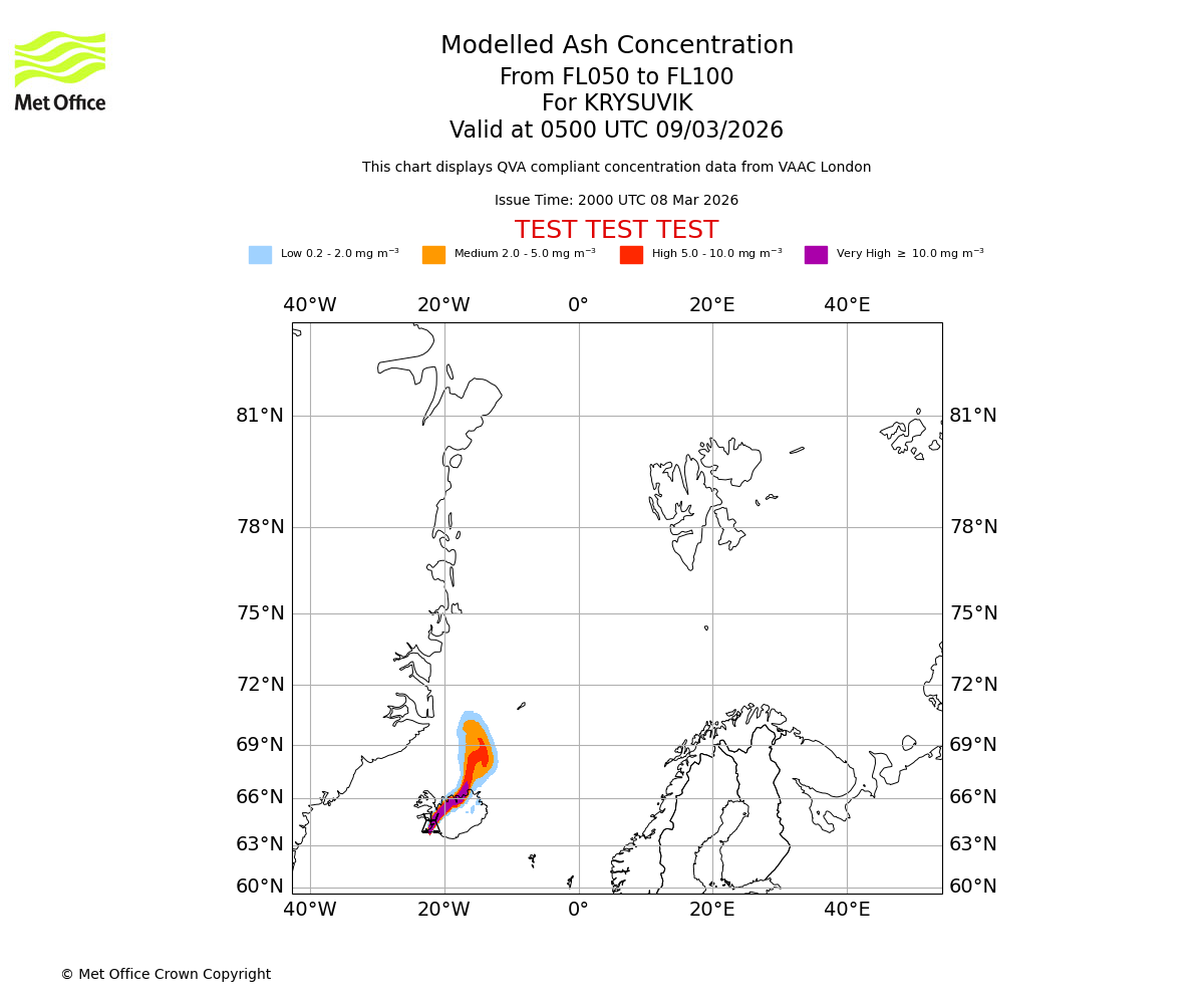 Modelled ash concentration from 050 to 100 for KRYSUVIK. Valid at 0200 UTC 09/03/2026