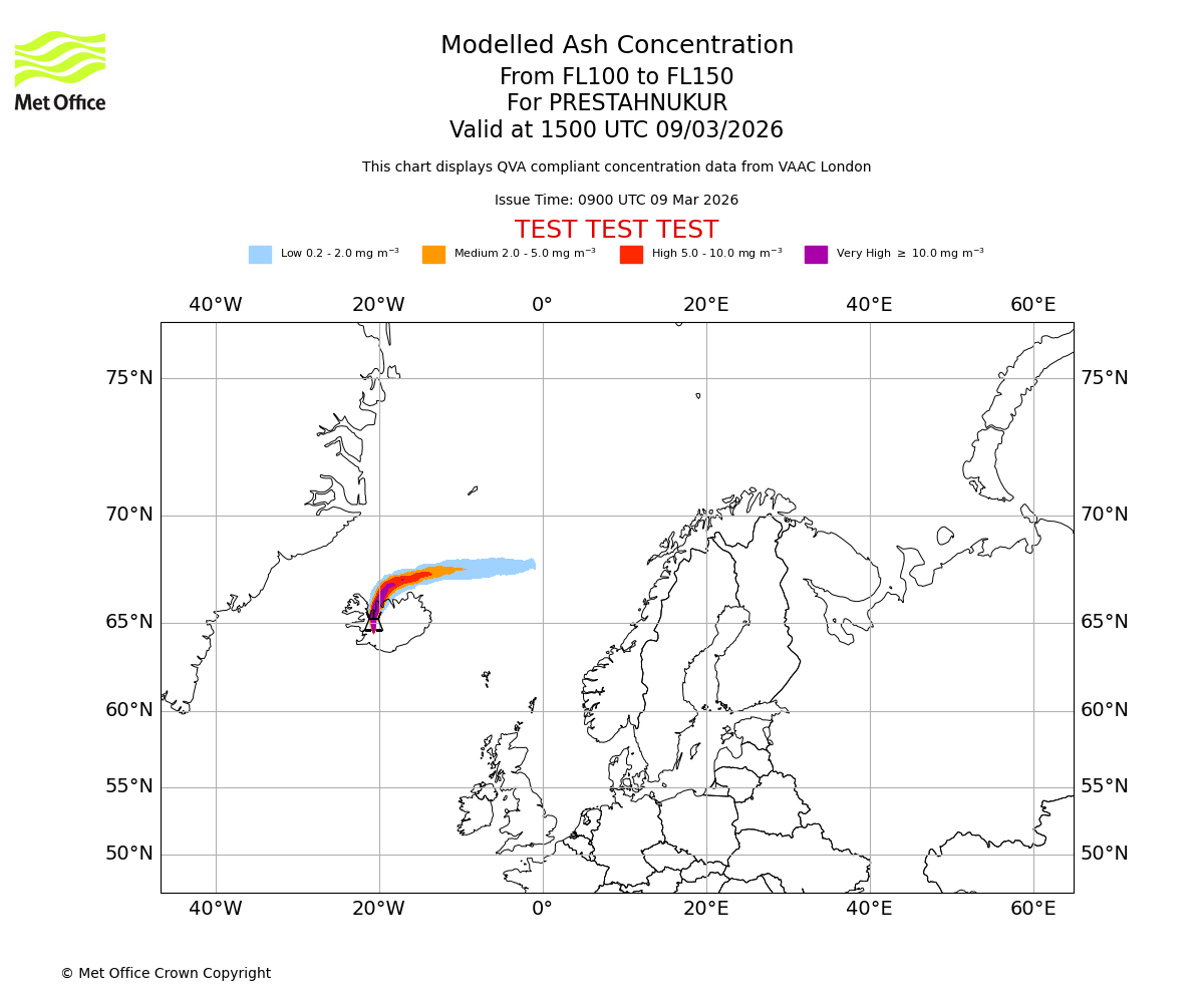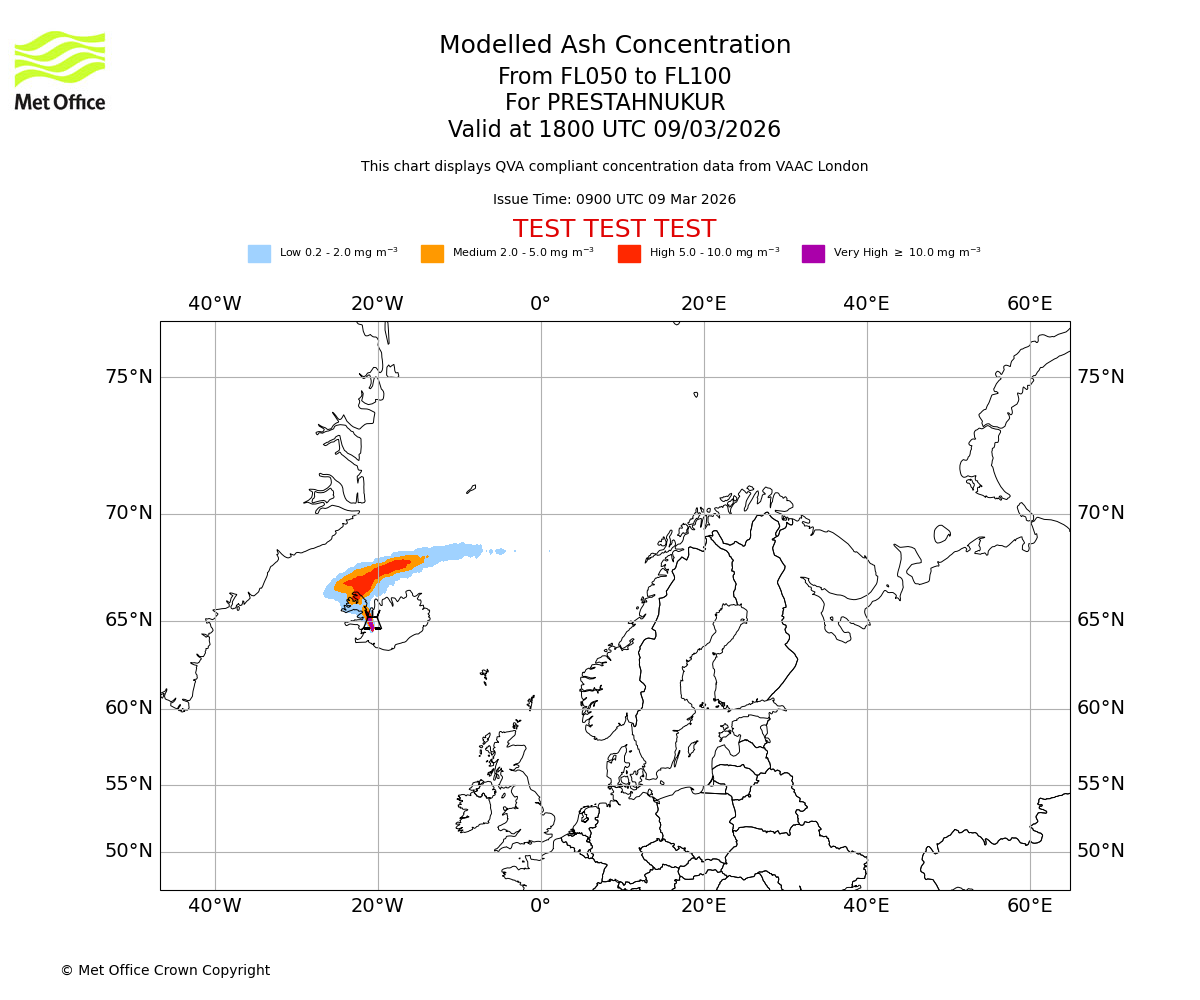 Modelled ash concentration from 050 to 100 for PRESTAHNUKUR. Valid at 1500 UTC 09/03/2026