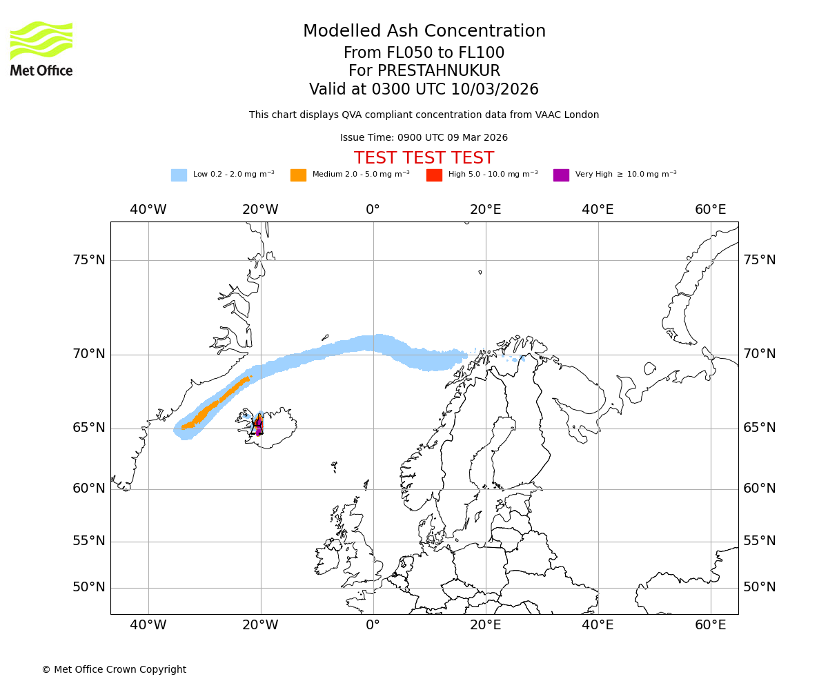 Modelled ash concentration from 050 to 100 for PRESTAHNUKUR. Valid at 0000 UTC 10/03/2026