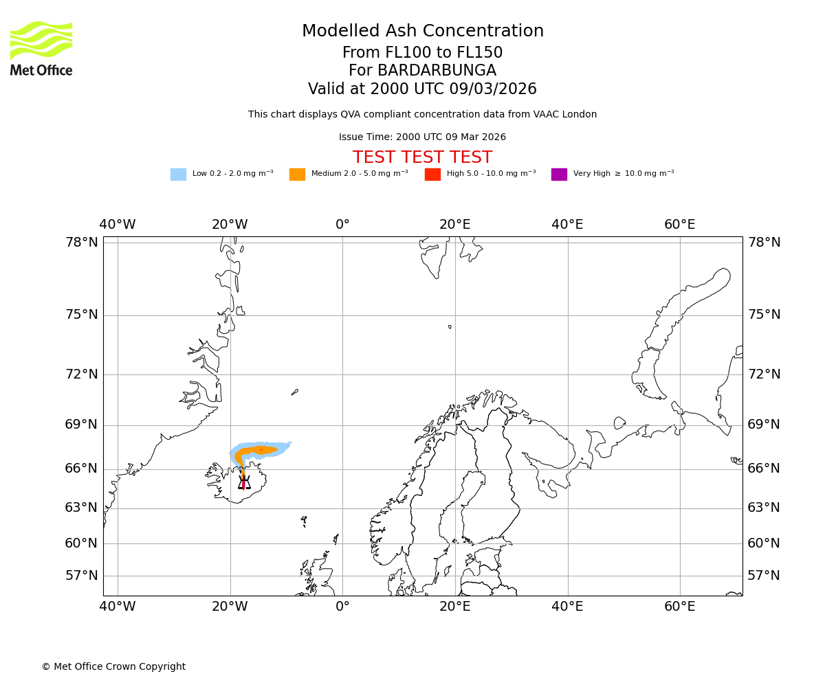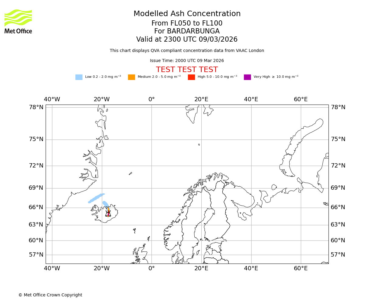 Modelled ash concentration from 050 to 100 for BARDARBUNGA. Valid at 2000 UTC 09/03/2026