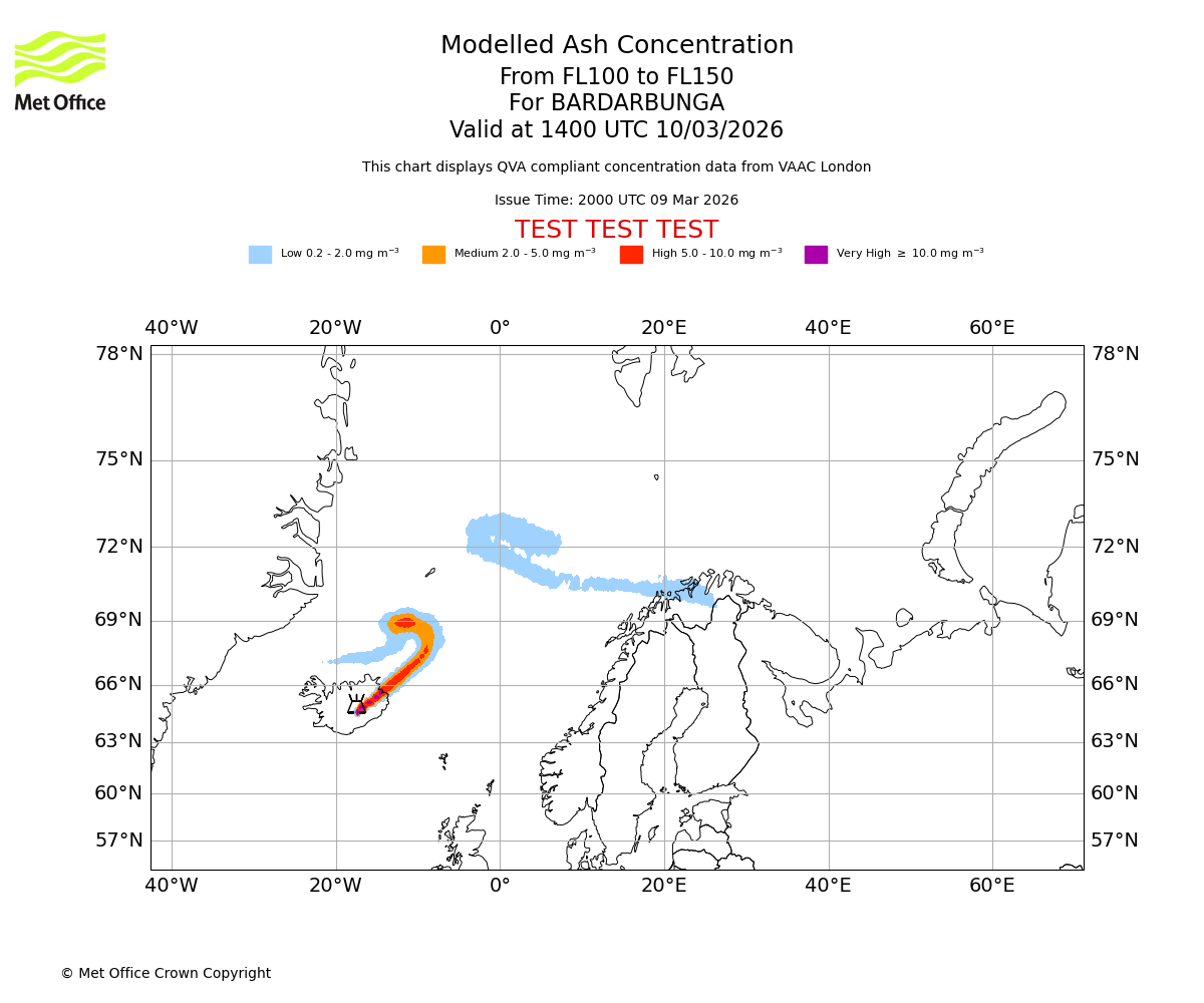 Modelled ash concentration from 050 to 100 for BARDARBUNGA. Valid at 1400 UTC 10/03/2026