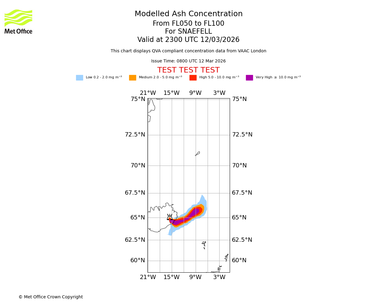 Modelled ash concentration from 050 to 100 for SNAEFELL. Valid at 2000 UTC 12/03/2026