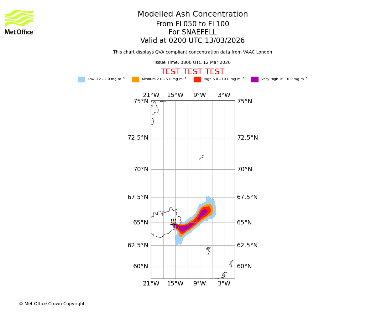 Modelled ash concentration from 000 to 200 for SNAEFELL. Valid at 0800 UTC 12/03/2026