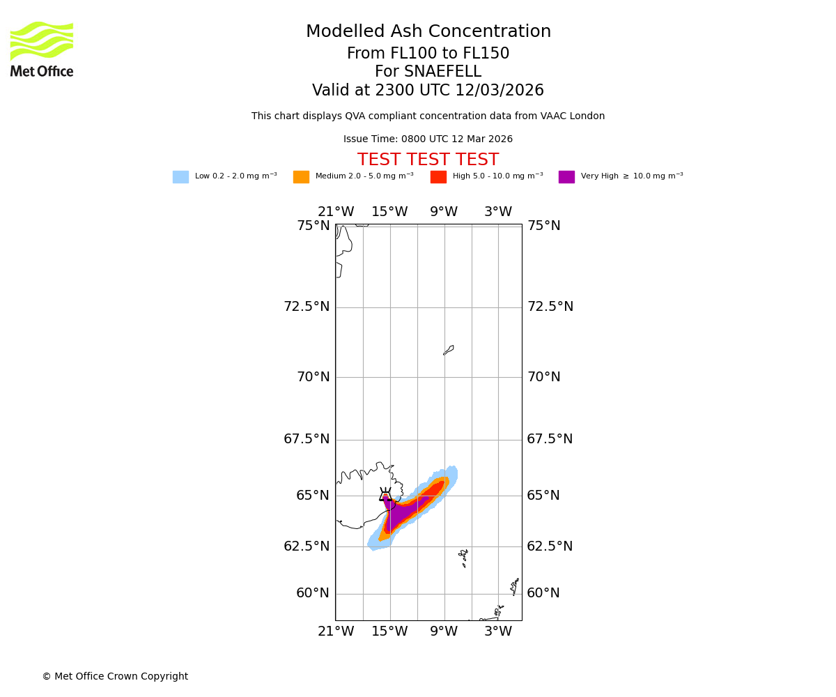 Modelled ash concentration from 050 to 100 for SNAEFELL. Valid at 2300 UTC 12/03/2026