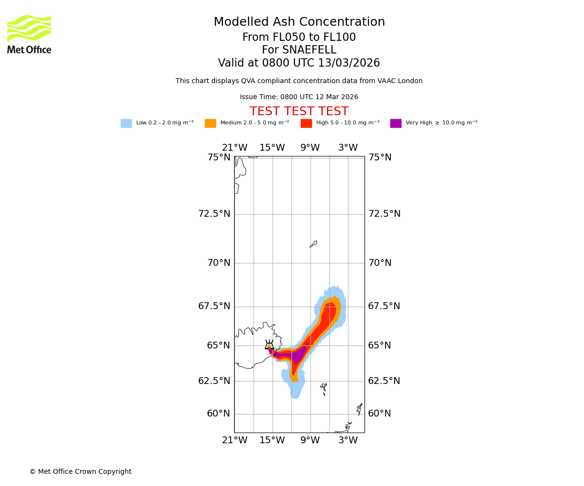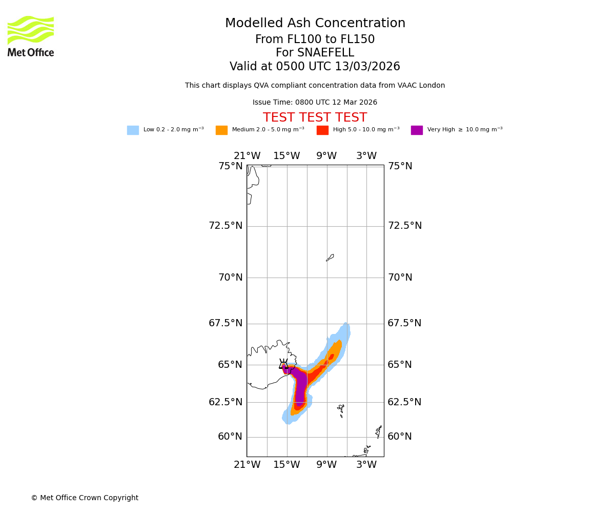 Modelled ash concentration from 050 to 100 for SNAEFELL. Valid at 0500 UTC 13/03/2026