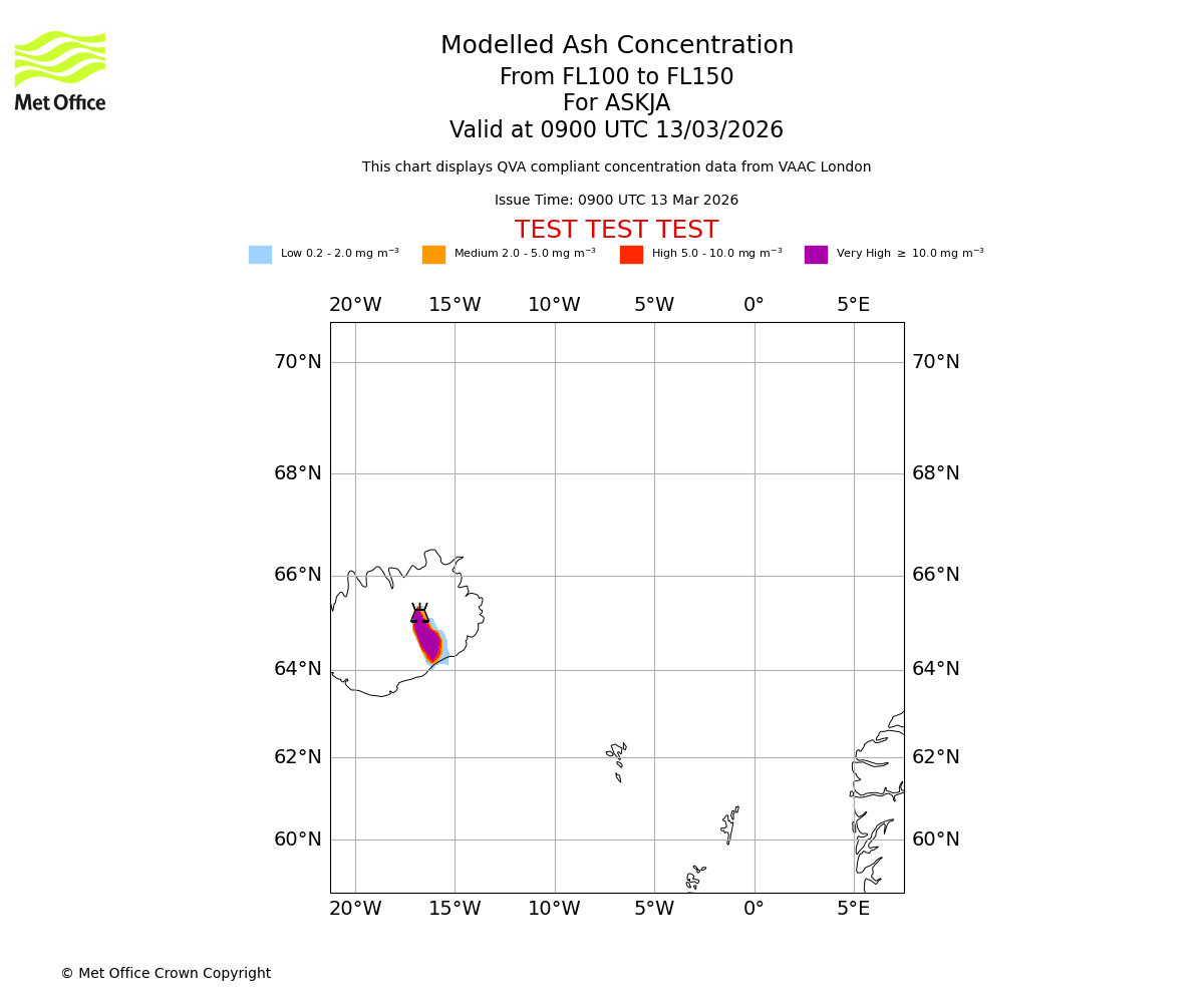 Modelled ash concentration from 050 to 100 for ASKJA. Valid at 0900 UTC 13/03/2026