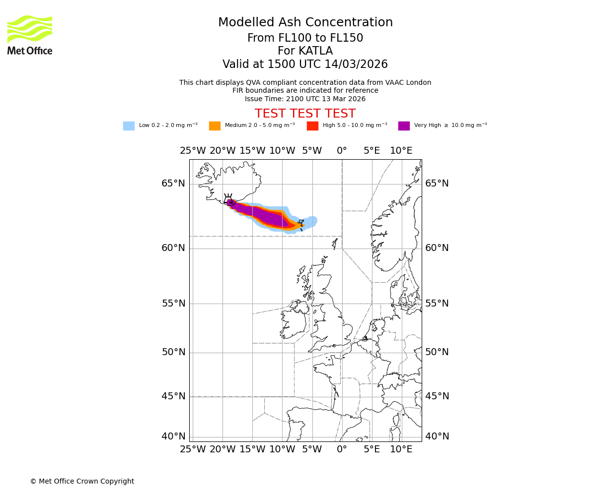 Modelled ash concentration from 050 to 100 for KATLA. Valid at 1500 UTC 14/03/2026
