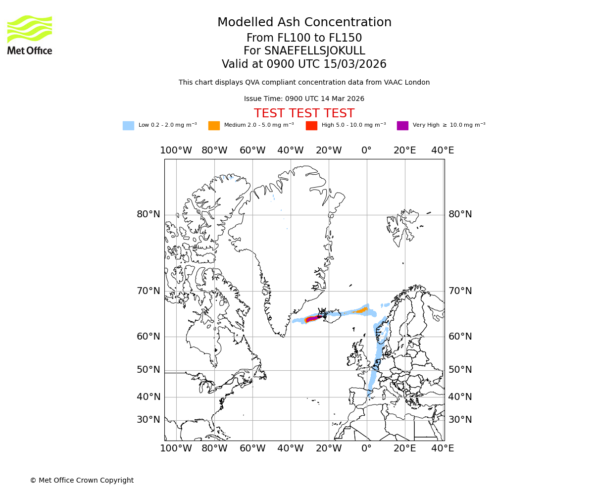 Modelled ash concentration from 050 to 100 for SNAEFELLSJOKULL. Valid at 0900 UTC 15/03/2026